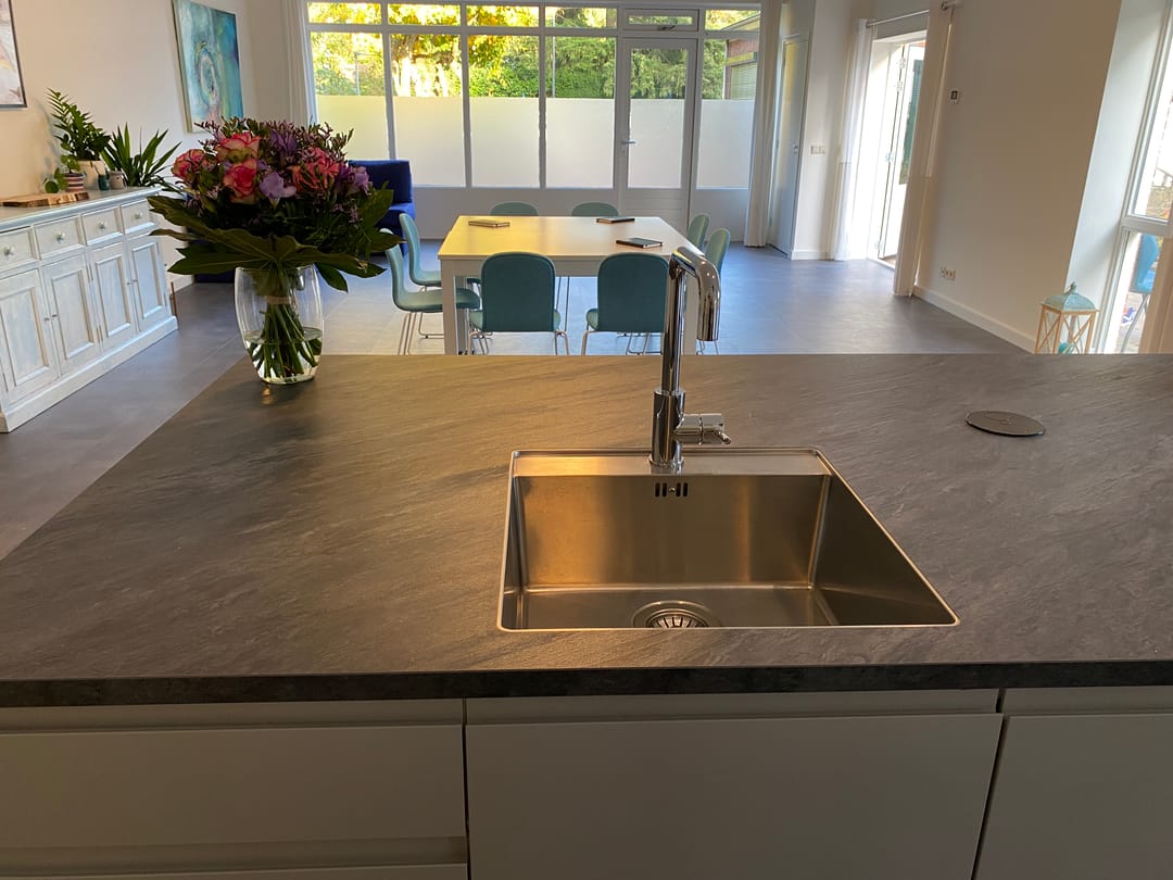 Keuken, pantry, toiletgroep. Verwarming d.m.v. warmtepomp in combinatie met vloerverwarming.