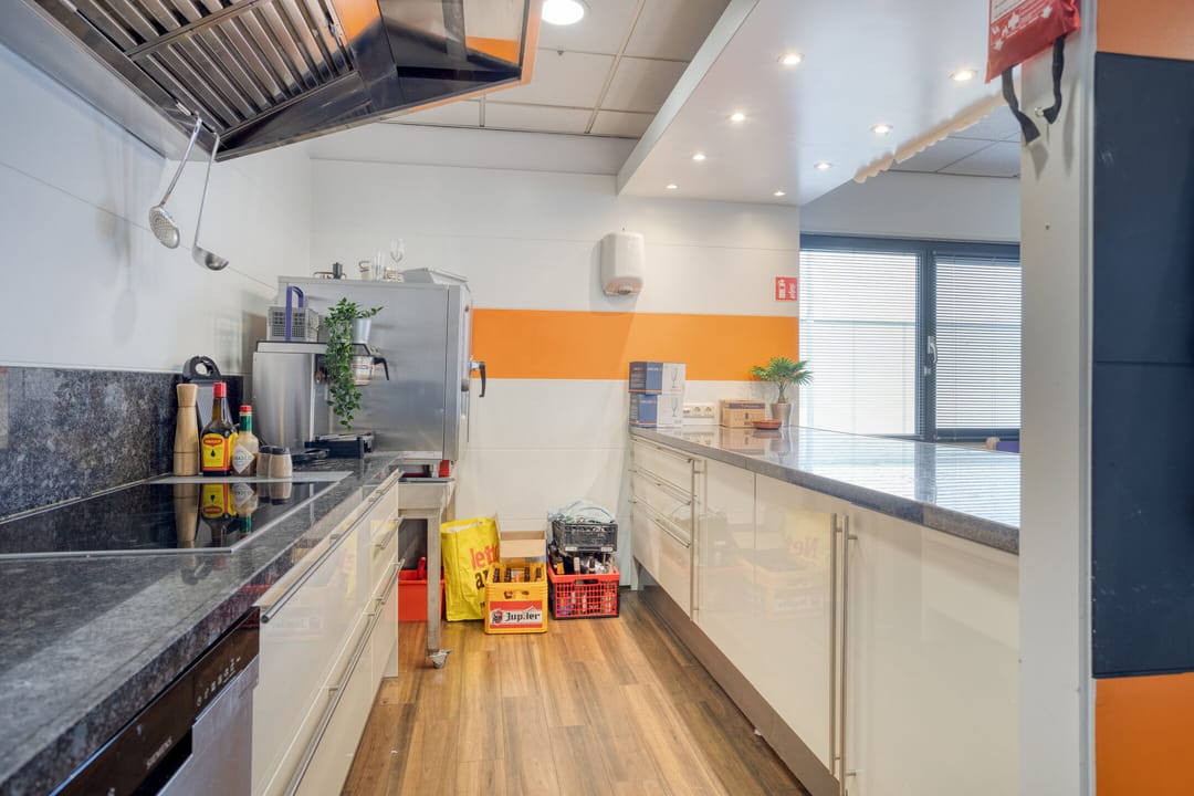 Bovenhal met vide, garderobe en toiletgroepen, diverse kantoorvertrekken in variërende oppervlakten, bedrijfskantine voorzien van twee keukenblokken met apparatuur.