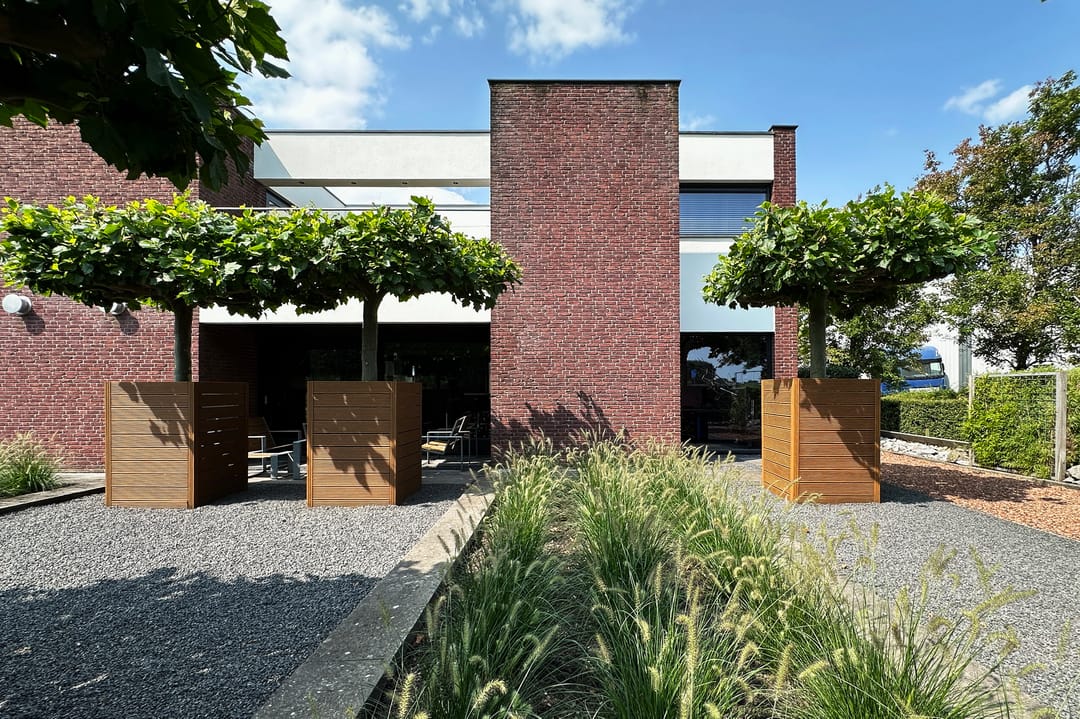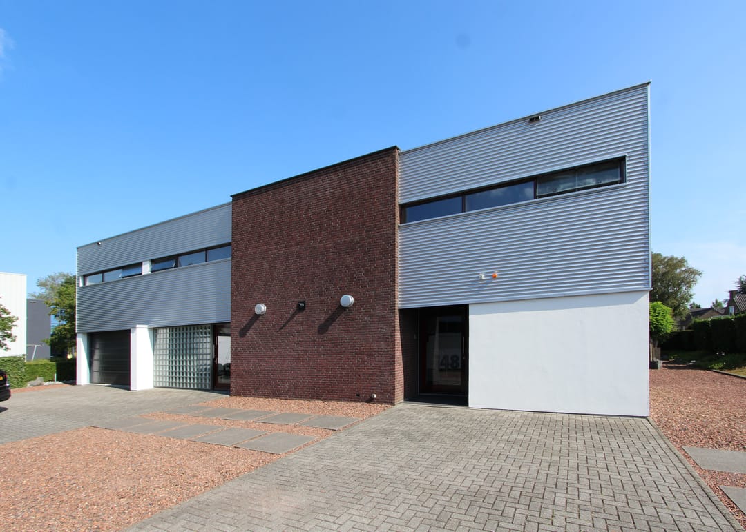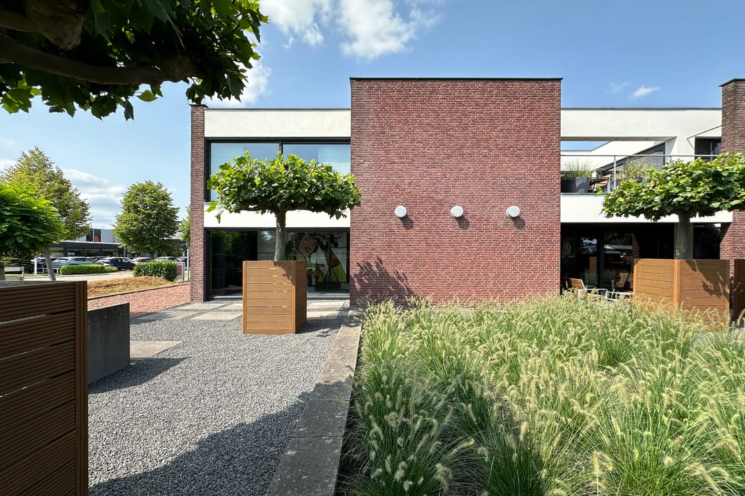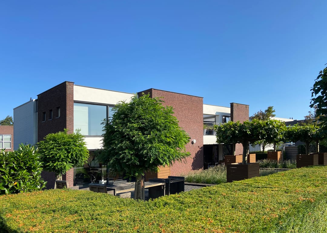 Op het ruime kavel is in de vormgeving / plattegrond van het gebouw ook in de tuin en de parking doorgezet. Dit zorgt ervoor dat alles naadloos op elkaar aansluit. Zelfs in de erfscheiding is de karakteristieke gevelbeplating op diverse plekken toegepast.