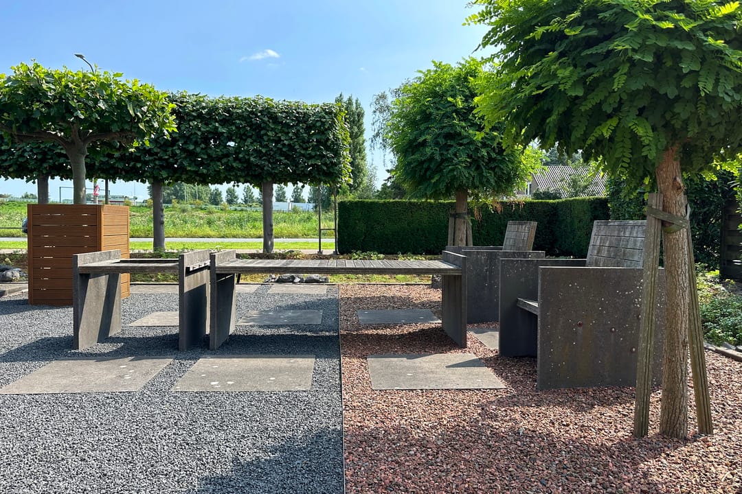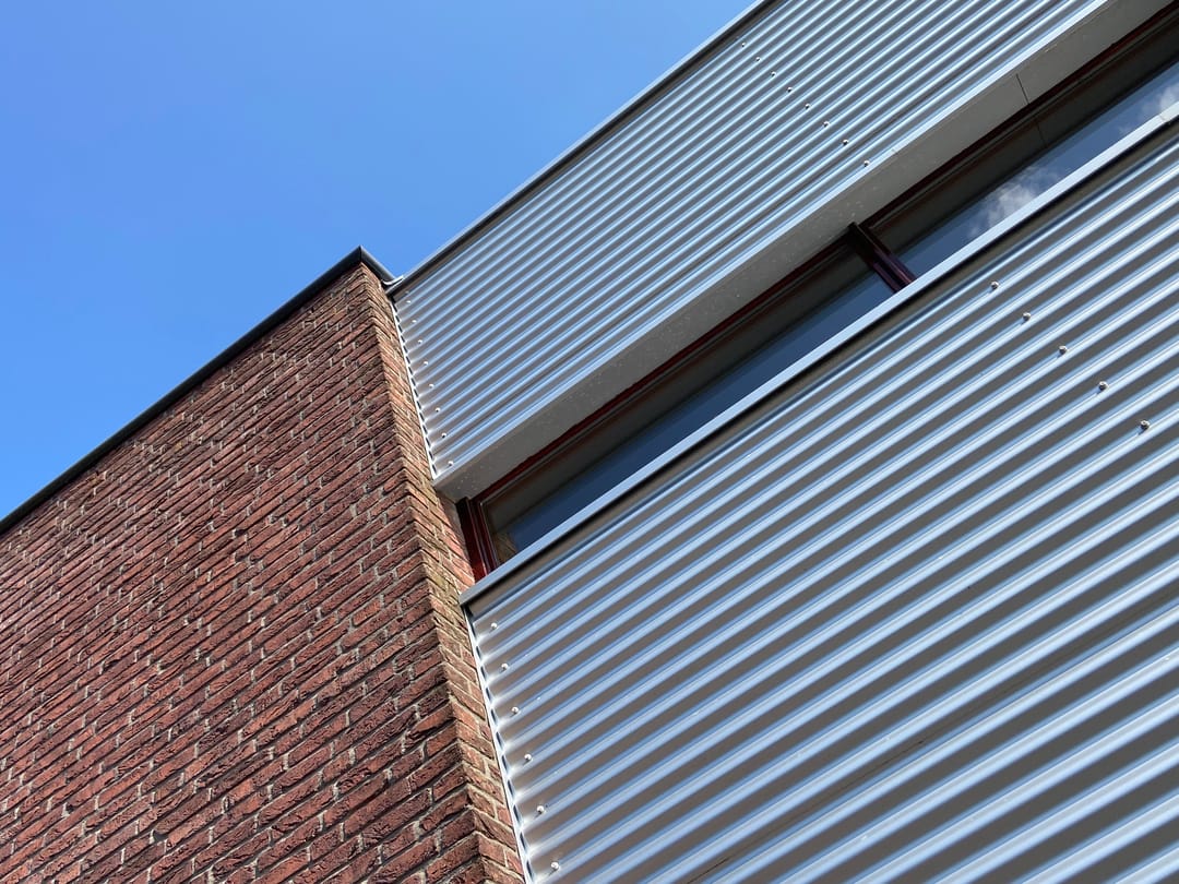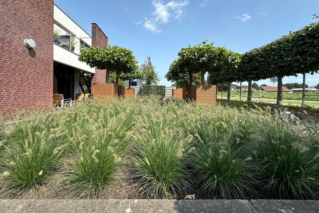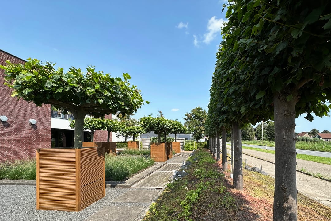 Op het ruime kavel is in de vormgeving / plattegrond van het gebouw ook in de tuin en de parking doorgezet. Dit zorgt ervoor dat alles naadloos op elkaar aansluit. Zelfs in de erfscheiding is de karakteristieke gevelbeplating op diverse plekken toegepast.