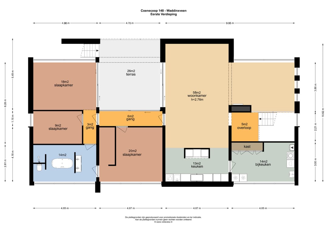 De verrassend ingedeelde woning met terras bevindt zich op de eerste verdieping en heeft met inbegrip van de zelfstandige entree/hal met toilet op de begane grond een oppervlakte van ca. 186 m², het terras een oppervlakte van ca. 26 m² en een privé berging met een oppervlakte van ca. 7 m².