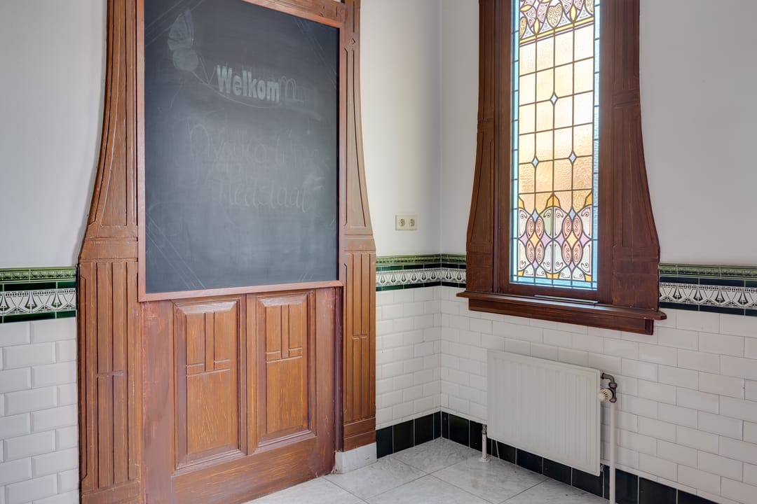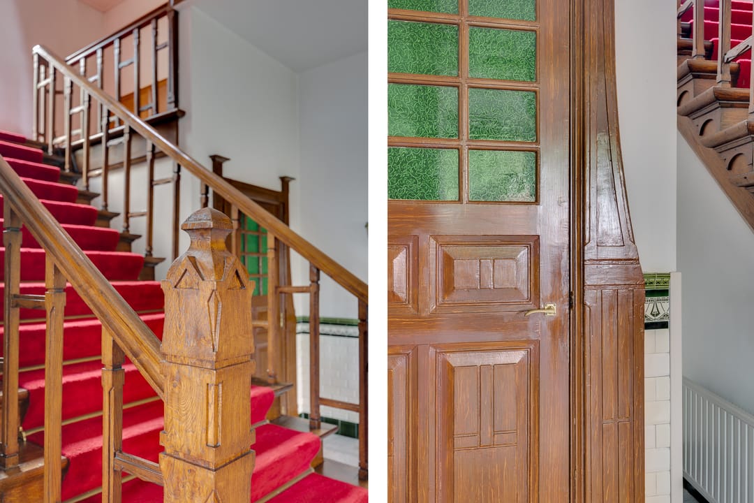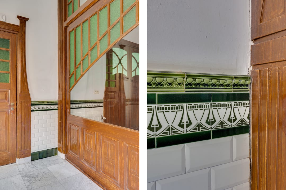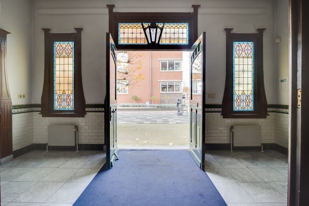 Stap binnen in dit stijlvolle monument. De fraaie entree met glas-in-loodramen, de hal met fraai betegelde lambrisering en het majestueuze trappenhuis geven karakter en authenticiteit.
