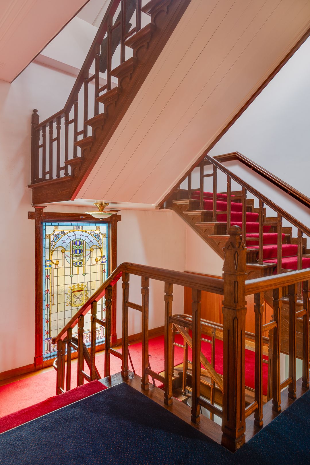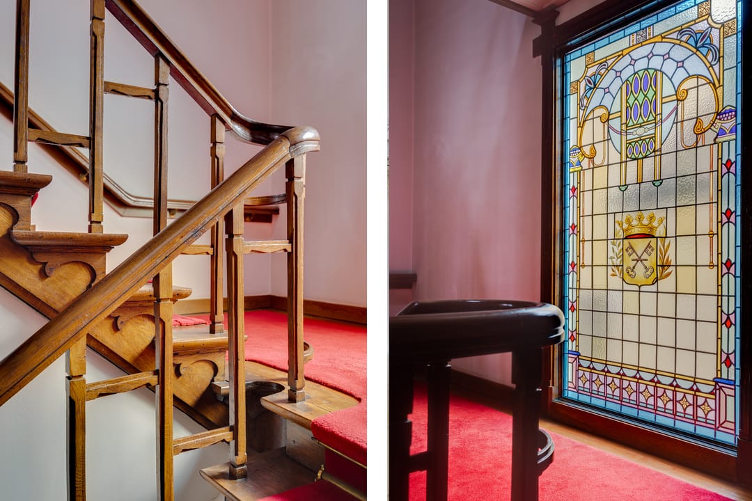 De vele originele details zoals de glas-in-loodramen, de hoge plafonds, paneeldeuren en de keizerstrap in donker eiken met houten hekwerken als balustrade zijn intact gebleven.