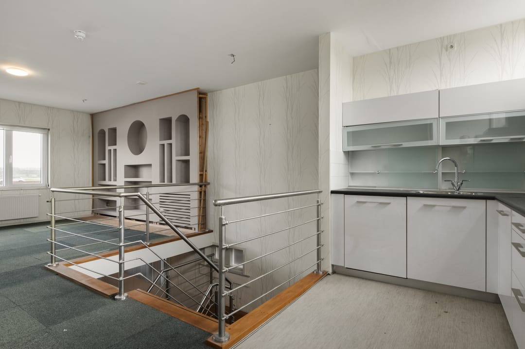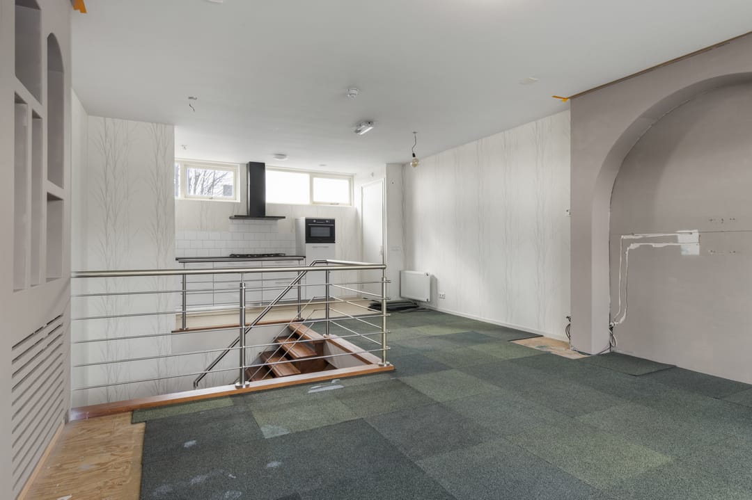 De begane grond is bereikbaar doormiddel van een bordestrap, deze is voorzien van een moderne pantry en een kantoor met uitzicht op de rivier de Gouwe.
