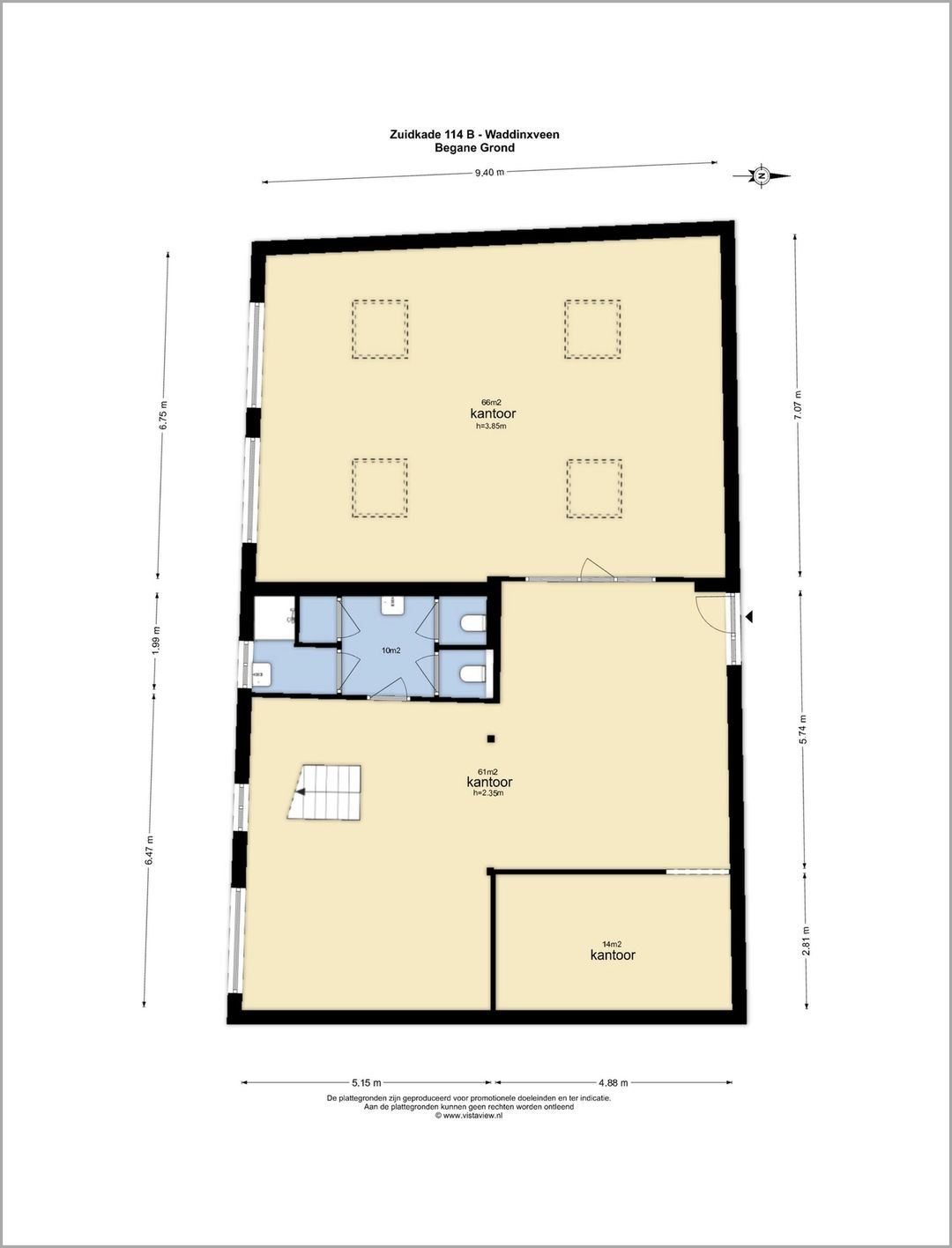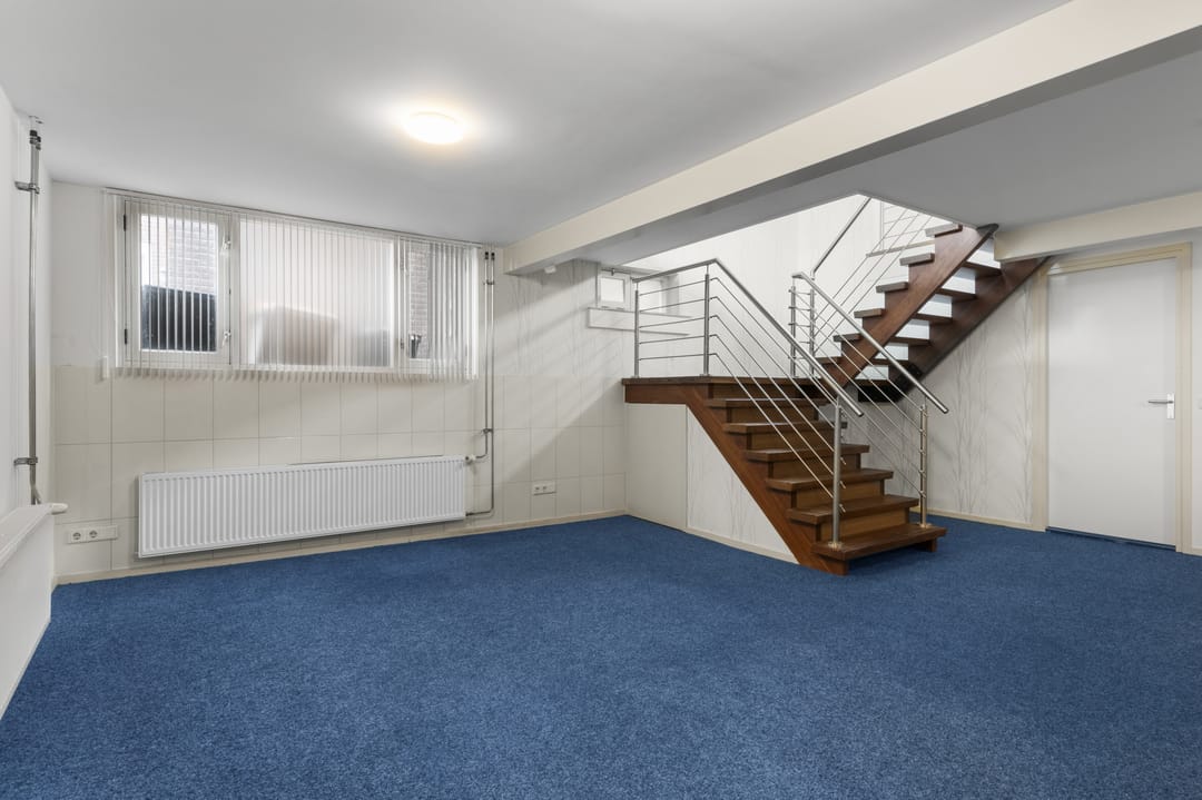 Via de hoofdentree is de kantoorruimte in het souterrain bereikbaar, deze ruimte is ingedeeld met 3 kantoorkamers en een sanitaire ruimte met toiletgroepen.