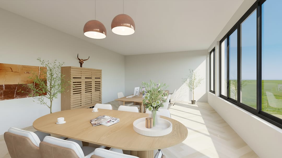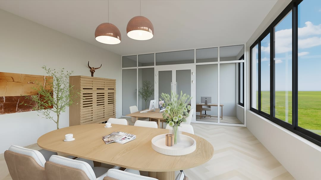- Lichte, rechthoekige ruimtes met grote aluminium puien en veel daglicht
