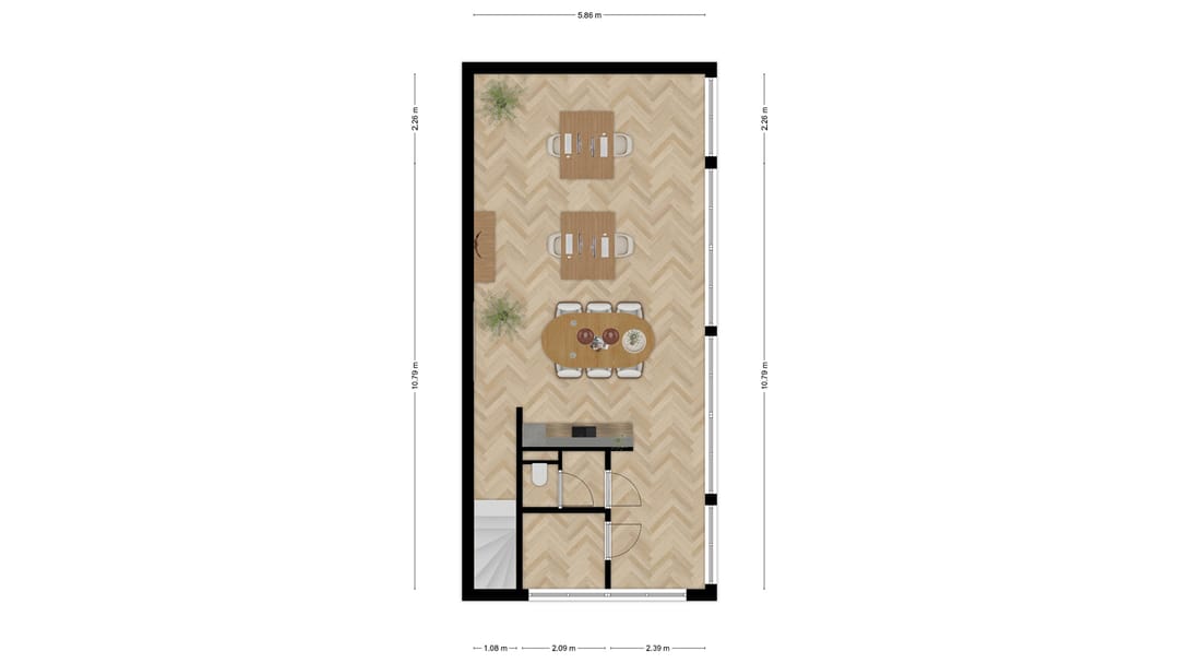 - Casco binnenafwerking: vloer, plafonds, verlichting, wanden en pantry naar eigen smaak te realiseren