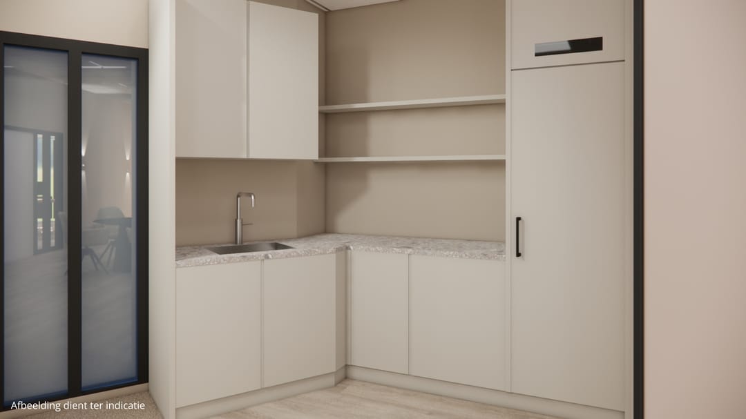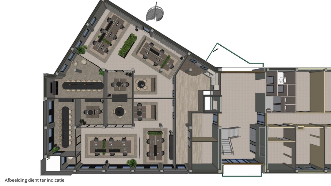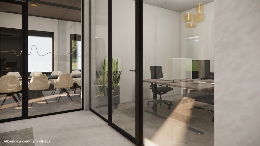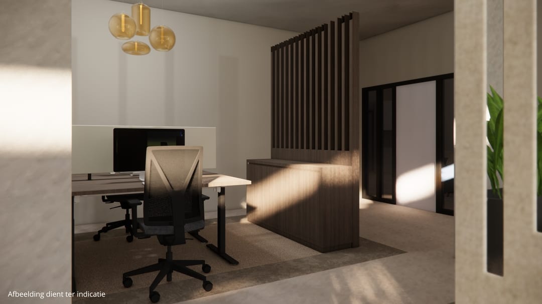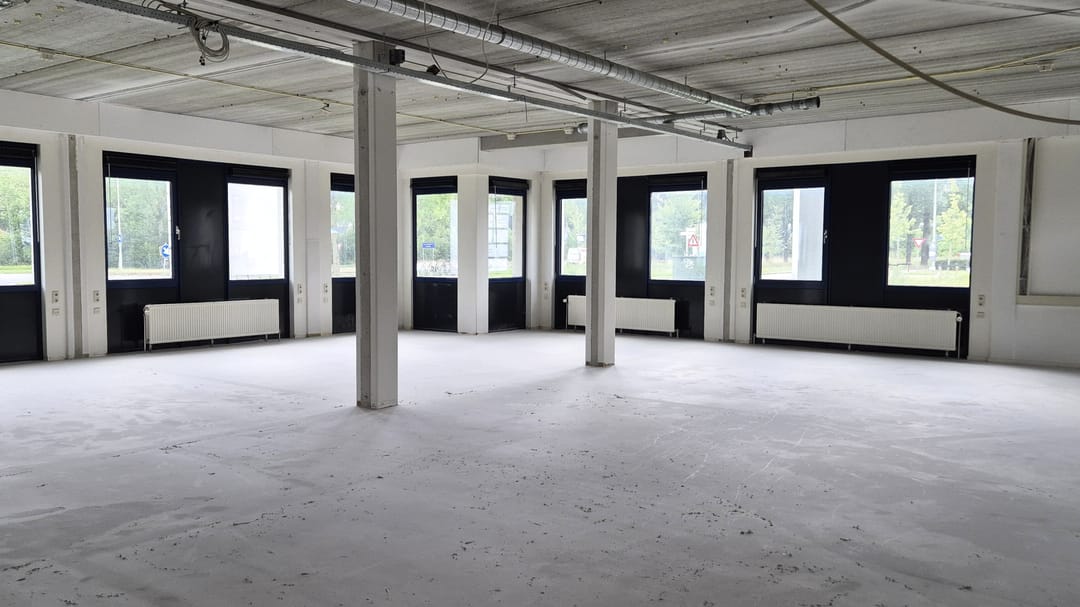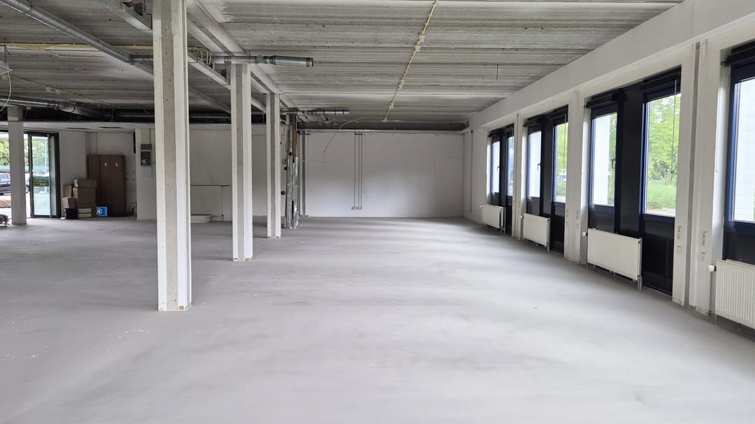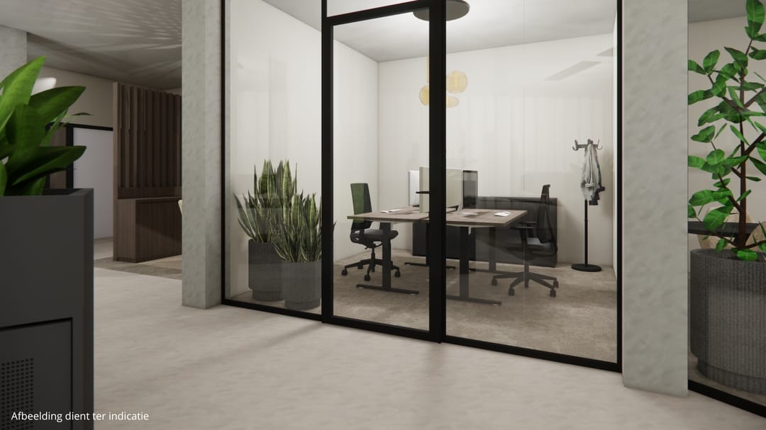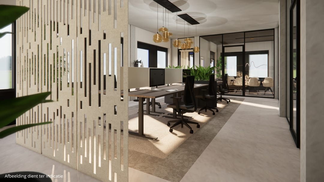 De ruimte die beschikbaar is, betreft een complete kantoorvleugel van ca. 410 m² met eigen entree, keuken en toiletruimte en is geheel vrij naar eigen inzicht in te delen. Er zijn afbeeldingen toegevoegd ter indicatie van hoe de ruimte eruit zou kunnen komen te zien.