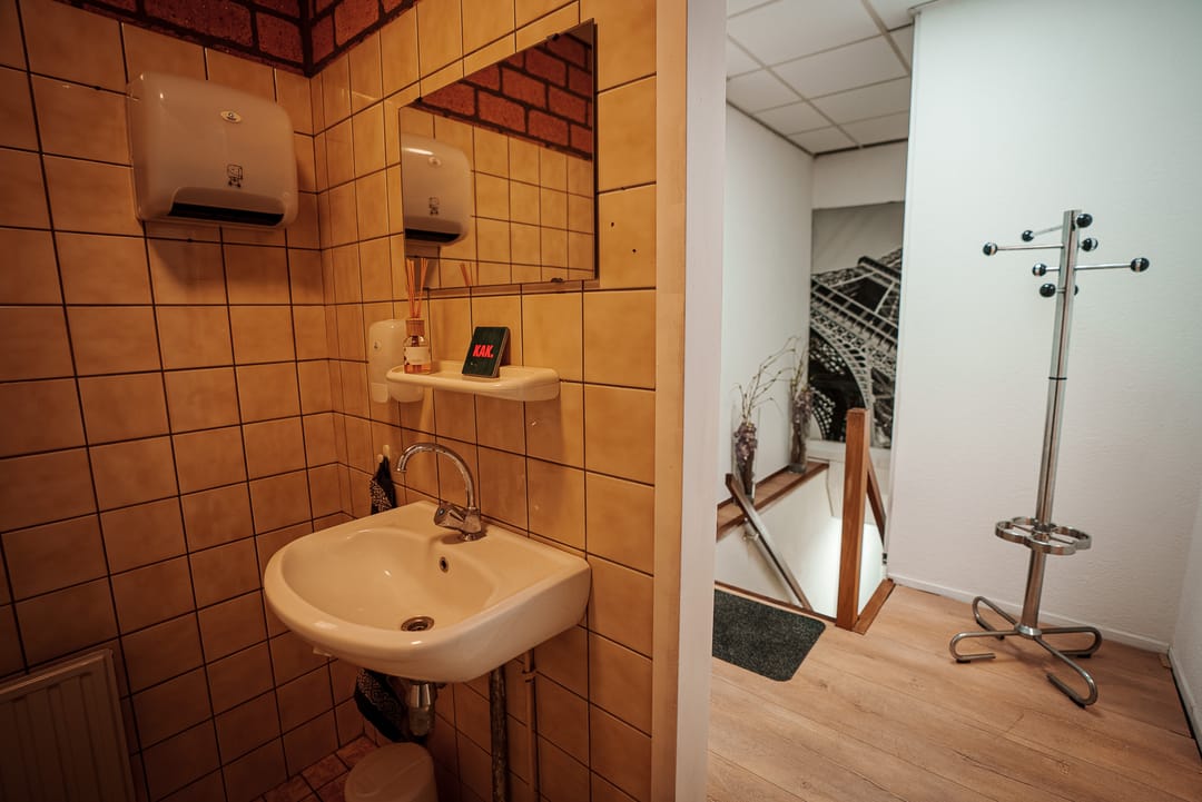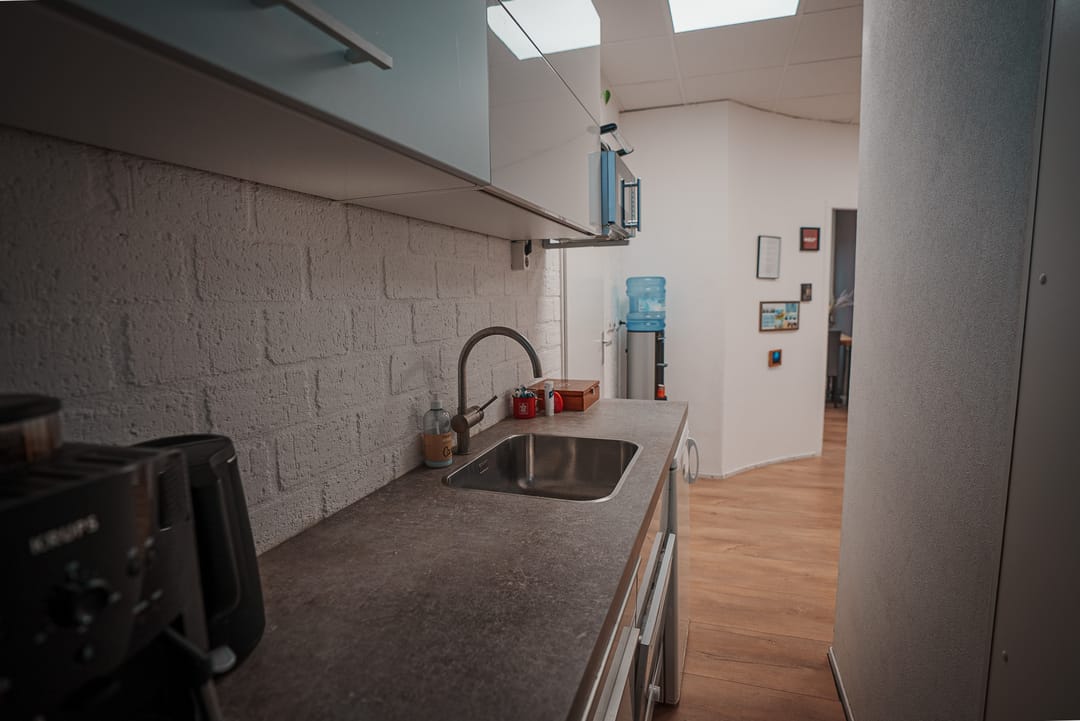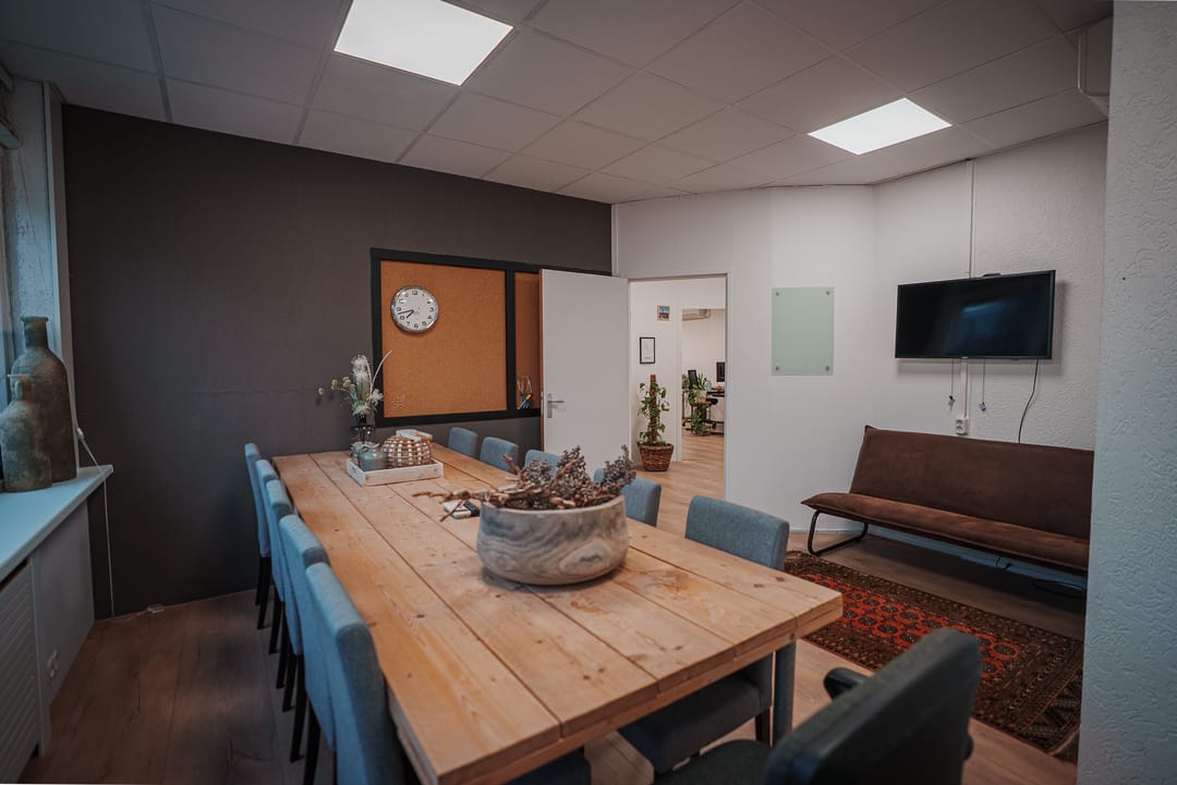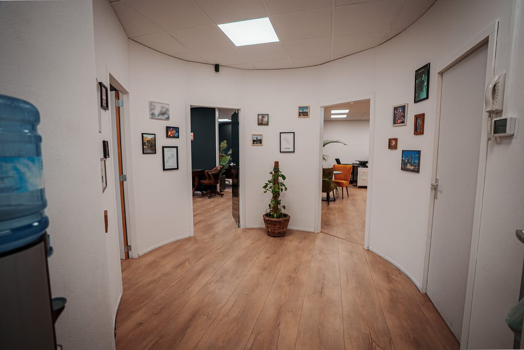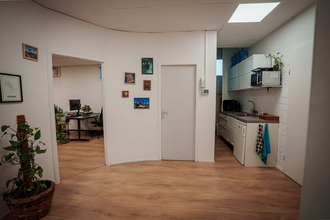 Overloop met separate toiletruimtes voor dames en heren. Vanuit de overloop zijn de representatieve kantoorruimtes bereikbaar. Tevens is er een separate vergaderkamer en aparte pantry met keukenblok.