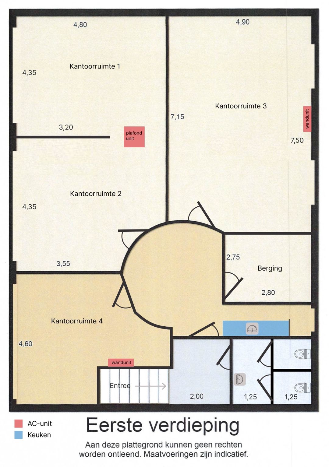 - Airconditioning, inbouwarmaturen, te openen ramen, kabelgoten, systeemplafond, toilet, pantry en kamerindeling