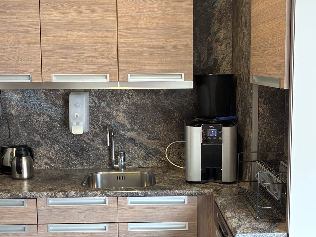 Entree tochtsluis met elektrische glazen schuifdeur. Gezamenlijke fraaie pantry en vergaderruimte, zowel op de begane grond als op de verdieping gezamenlijke toiletruimte met dubbel toilet, urinoir en wastafel.