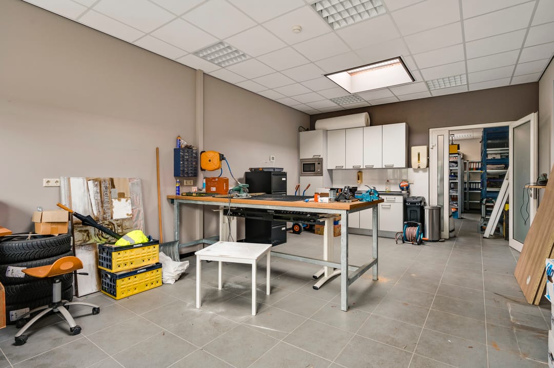 Achter op het perceel ligt een zelfstandige bedrijfsruimte van circa 62 m². De ruimte is verdeeld over twee delen en beschikt over een eigen cv-installatie, radiatoren, systeemplafond, airco, lichtkoepels, krachtstroom en een extra groepenkast. Dankzij deze voorzieningen is deze ruimte uitstekend geschikt als werkplaats, atelier of ondersteunende bedrijfsruimte. Vanuit de tuin is bovendien toegang tot twee bergingen, deze kunnen worden gebruikt voor opslag van materialen of gereedschap.