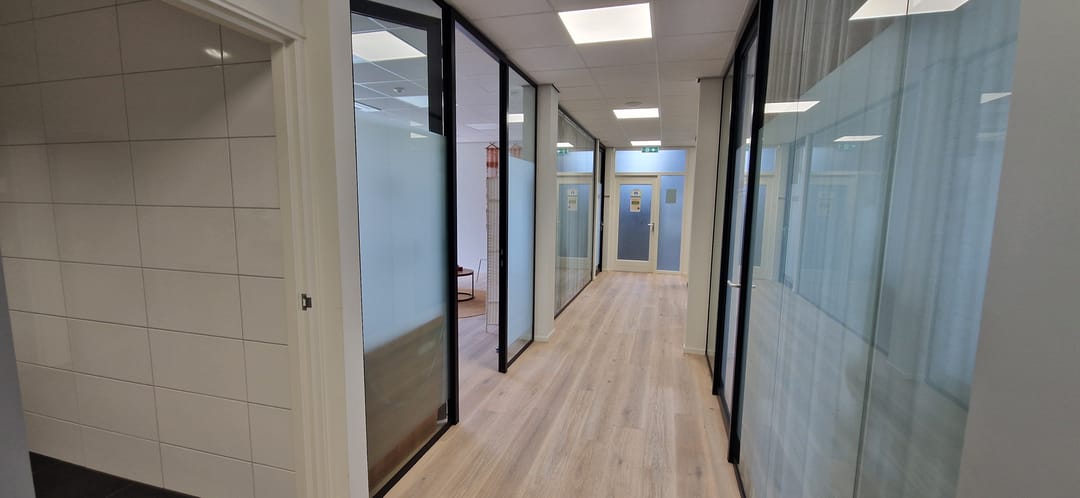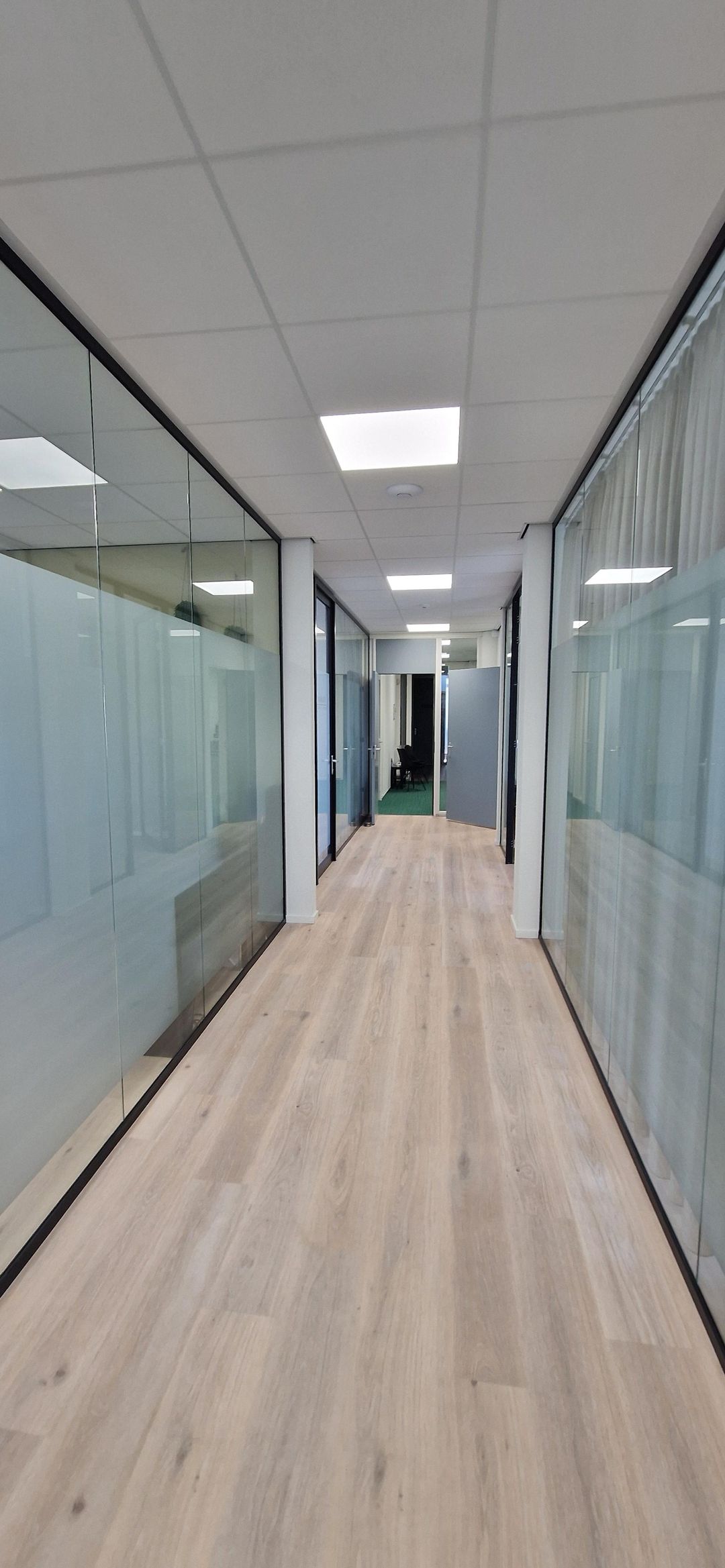 • huidige pvc-vloer en plafond hoge (glazen-)scheidingswanden;
