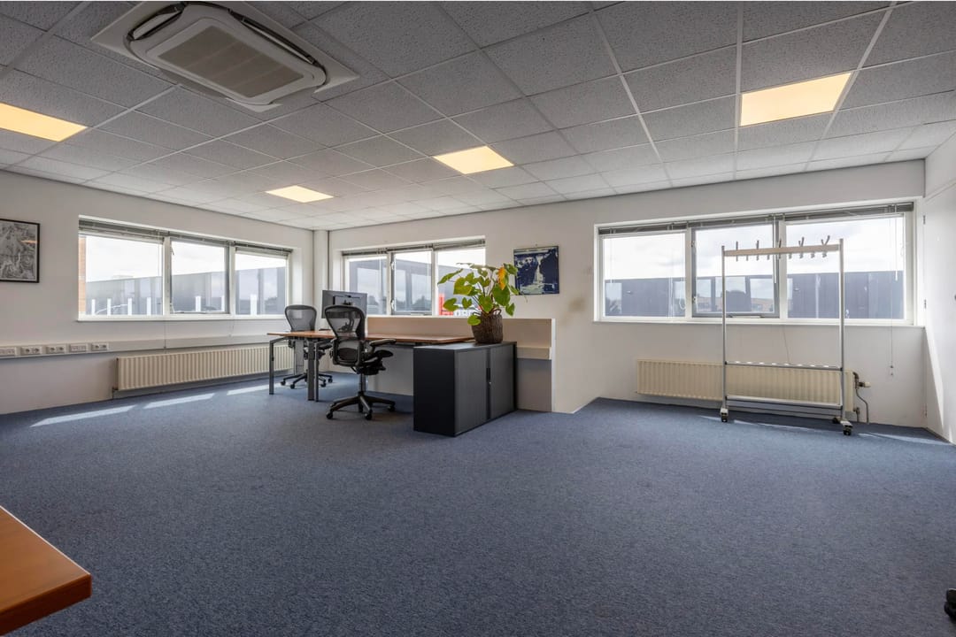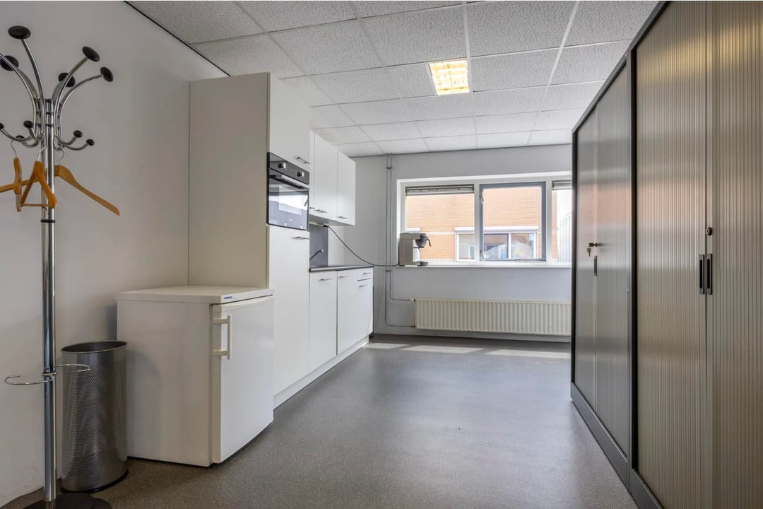 1e verdieping: Een riante lichte kantoorruimte met een nette keuken, en een tweede kantoorkamer met veel opbergruimte.