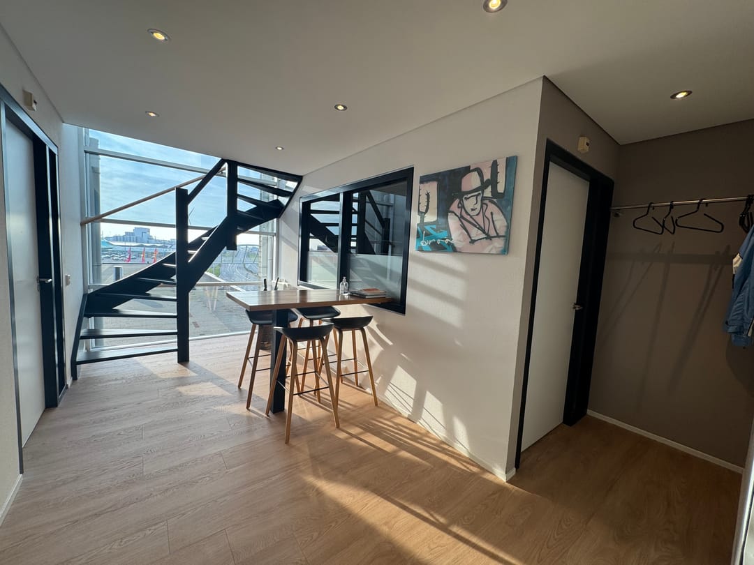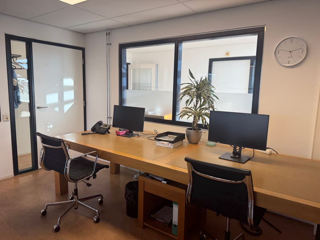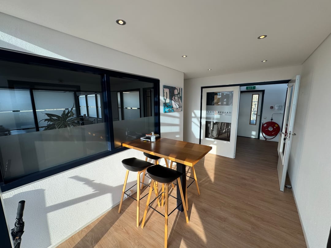 Een bijzonder element is de aanwezige mezzanine, waar zich een separate spreekkamer bevindt – ideaal voor vergaderingen of vertrouwelijke gesprekken.
