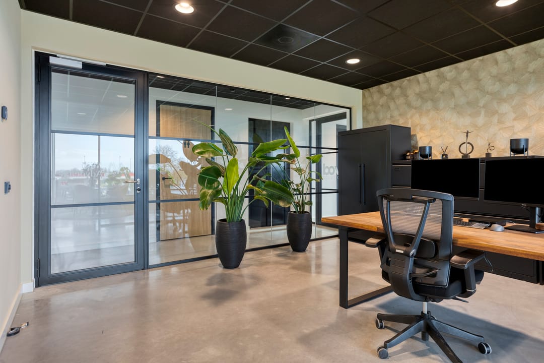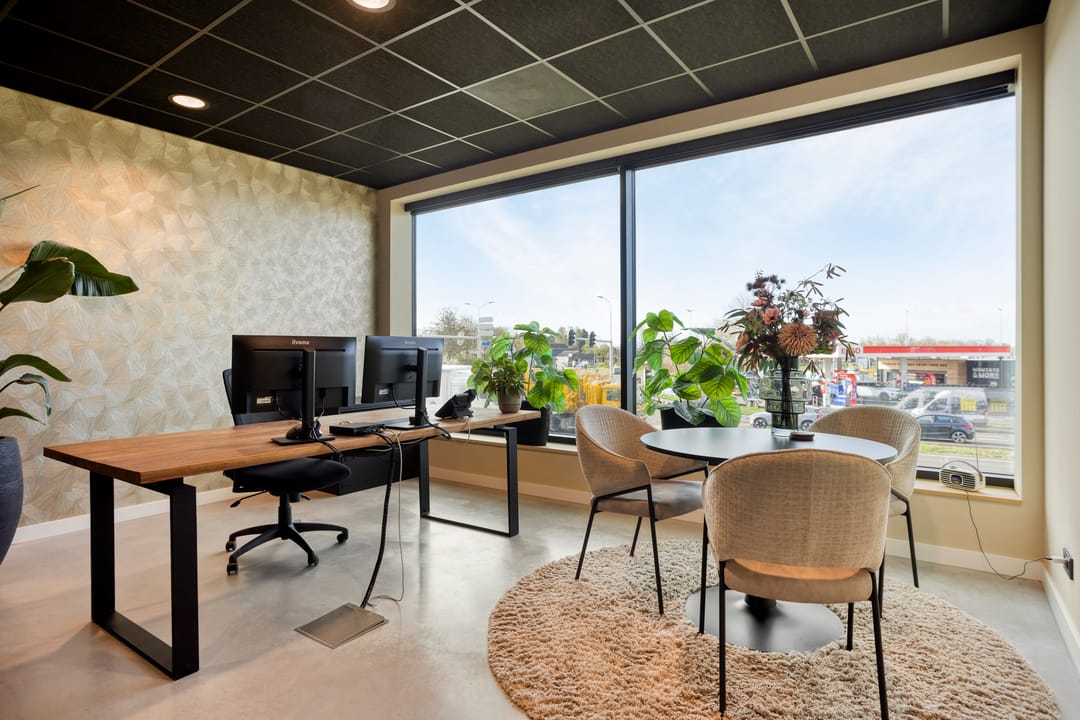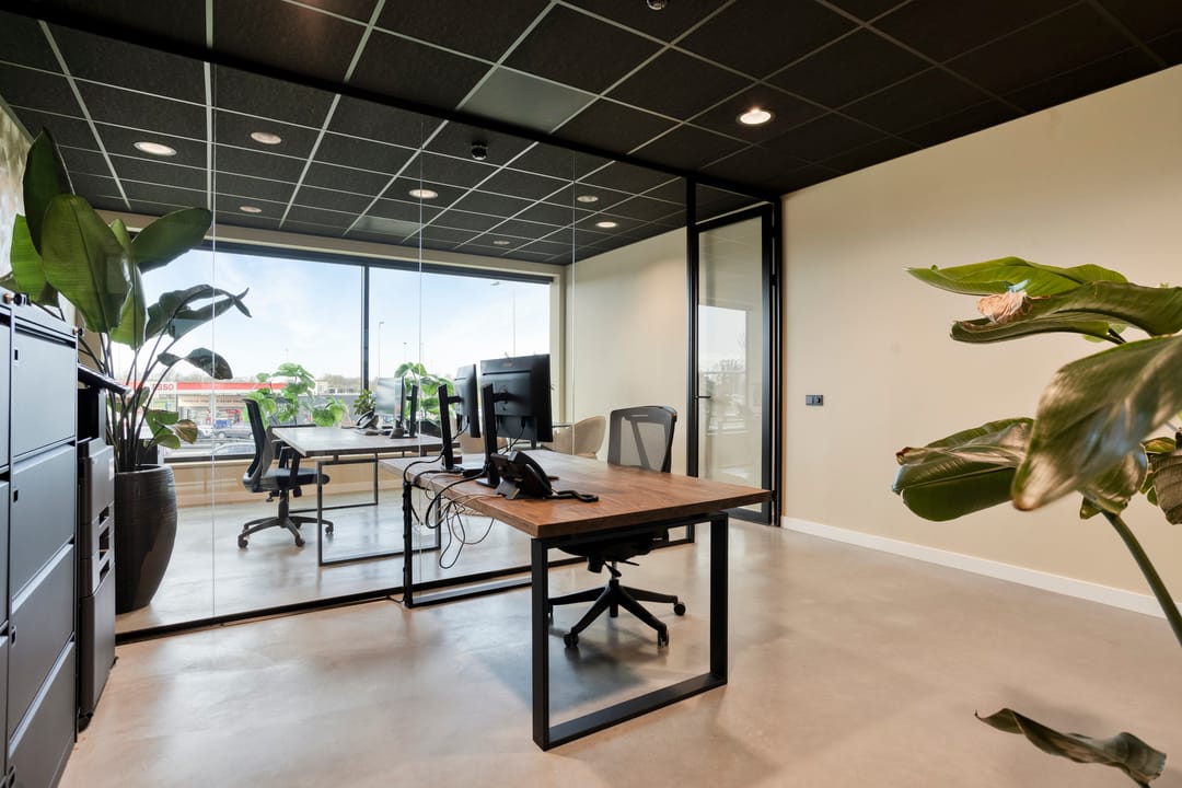 De kantoorruimte is strak afgewerkt en efficiënt ingericht. Door de opzet is het mogelijk de ruimte als één geheel te gebruiken of op te delen in twee werkruimtes, bijvoorbeeld voor kantoor en overleg.