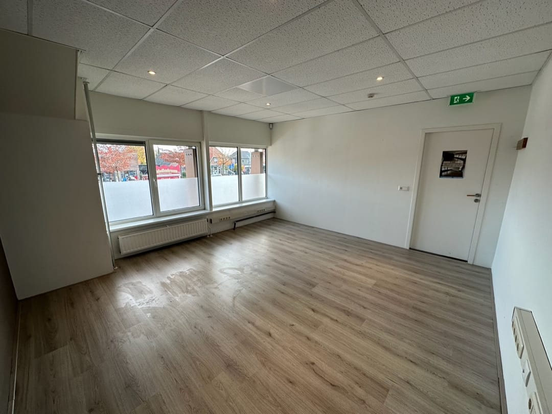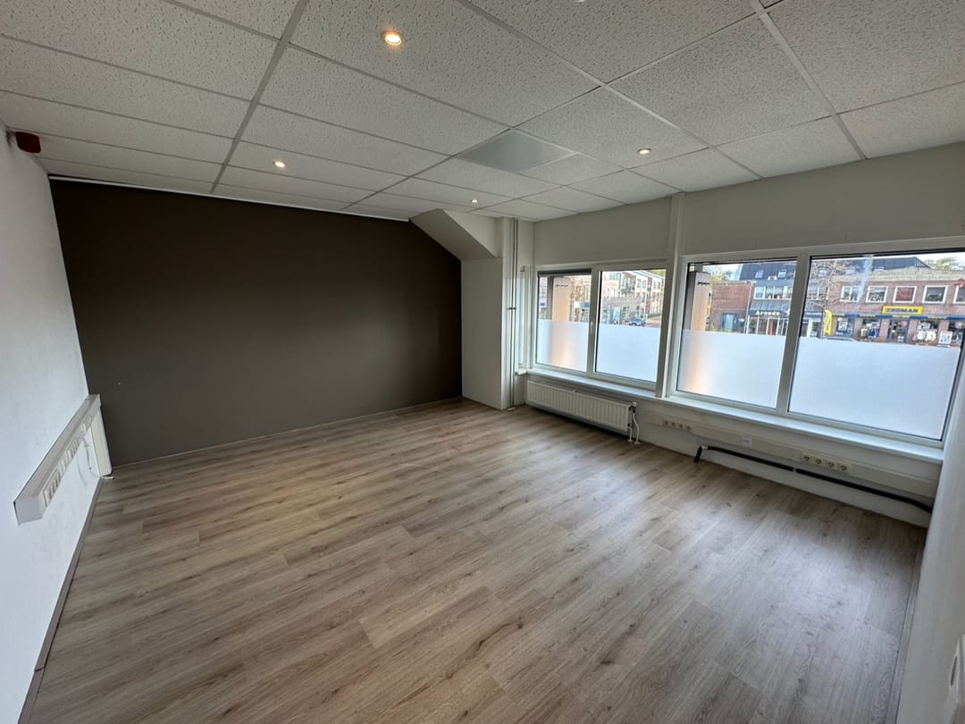 De twee ruimtes zijn op de eerste verdieping. De ruimte aan de voorzijde van het pand is circa 20 vierkante meter en heeft openslaande ramen, deze ruimte is beschikbaar vanaf circa €450 per maand exclusief servicekosten.