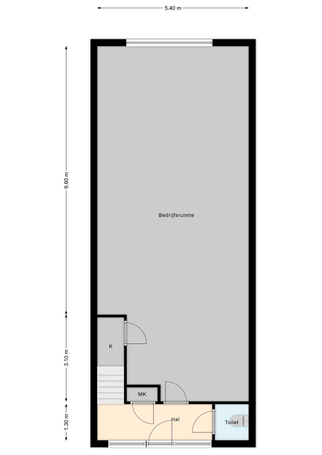 Begane grond: Entree naar de hal met toilet, meterkast en toegang tot de bedrijfsruimte. Vanuit de hal is een trapopgang naar de eerste verdieping met een ruime kantoorruimte.