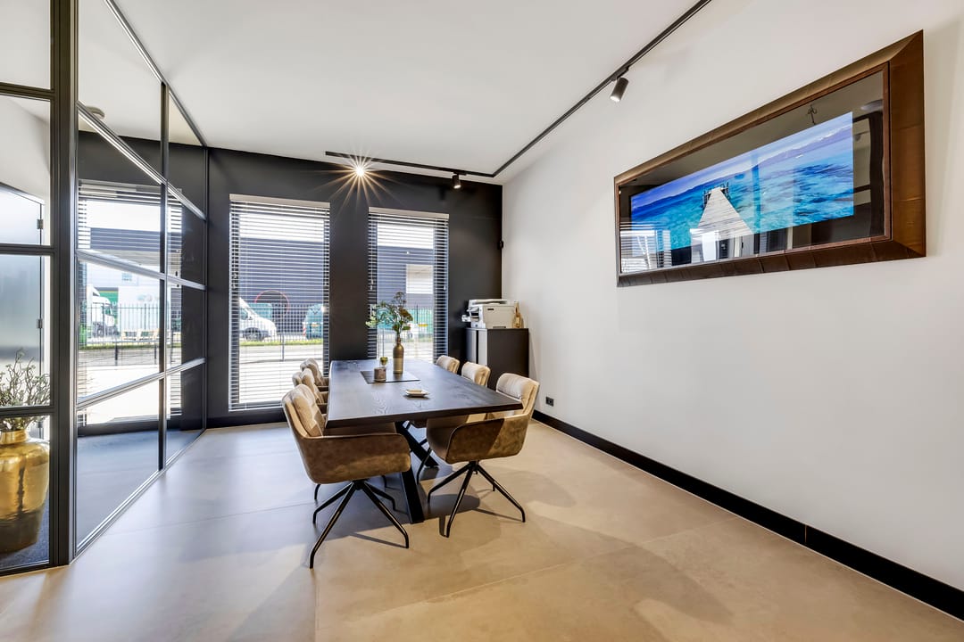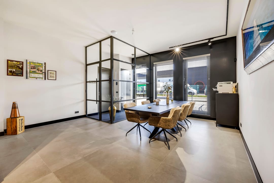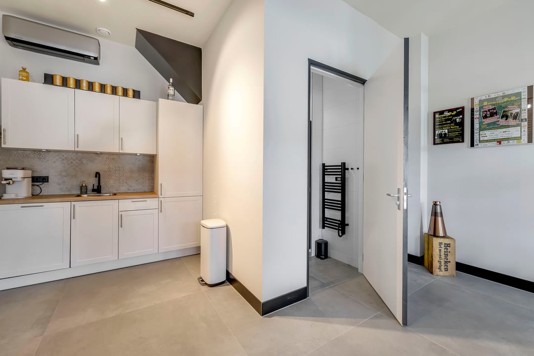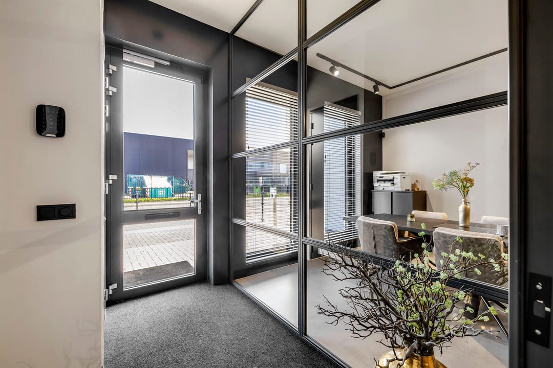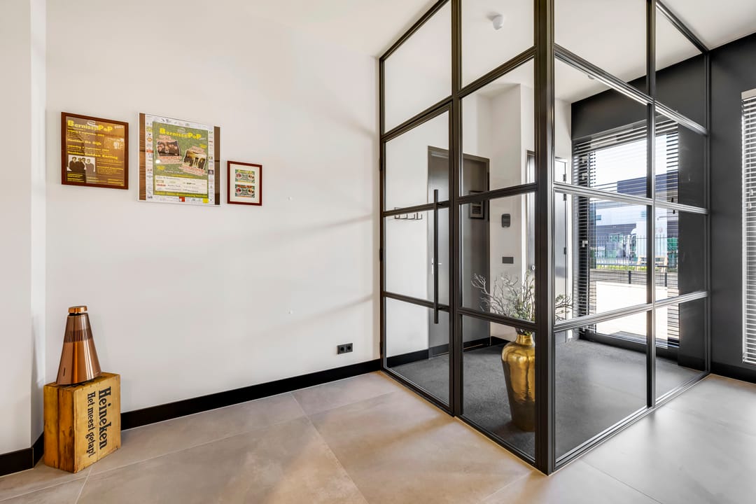 Stijlvolle entree met industriële zwartstalen pui, toegang tot de bedrijfshal en doorloop naar de showroom / spreekkamer aan de voorzijde van het pand. Deze ruimte is voorzien een keurig gelegde tegelvloer, pantry in rechte opstelling en lichte kleurstelling voorzien van inductie-kookplaat, vaatwasser, koelkast en vriezer. Aansluitend de luxe volledig betegelde douche met cabine, wastafelmeubel en handdoekradiator. De ruimte is voorzien van mechanische ventilatie.