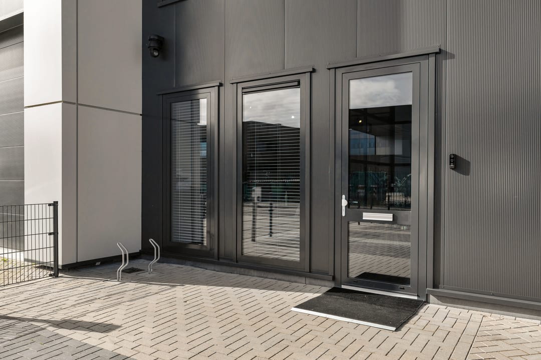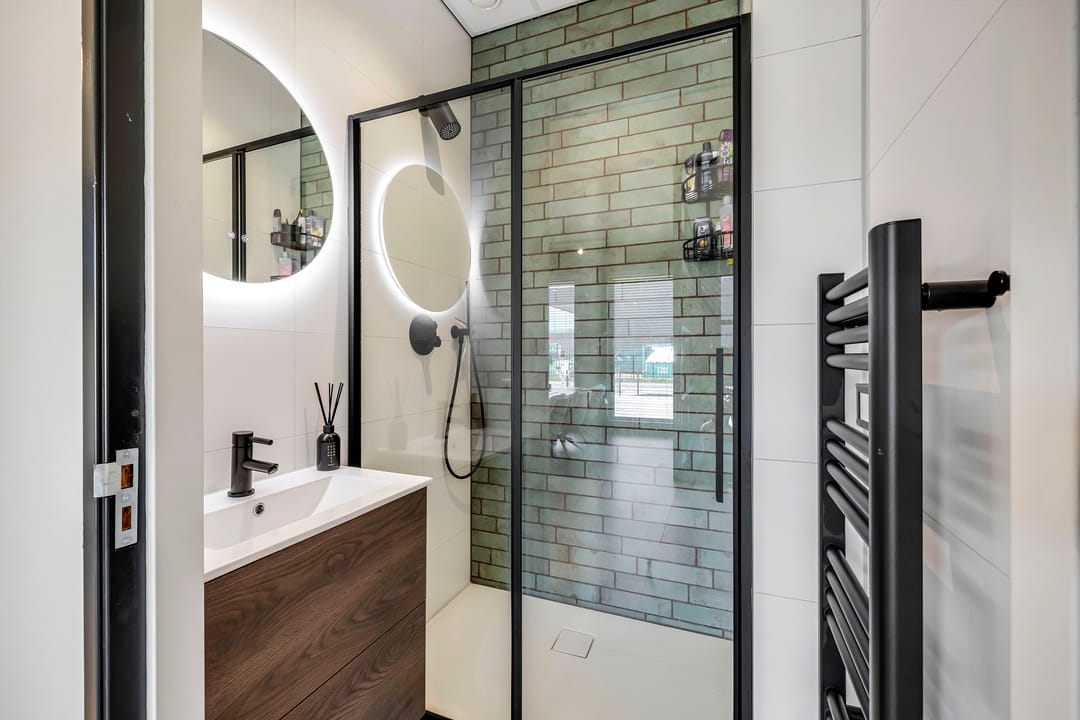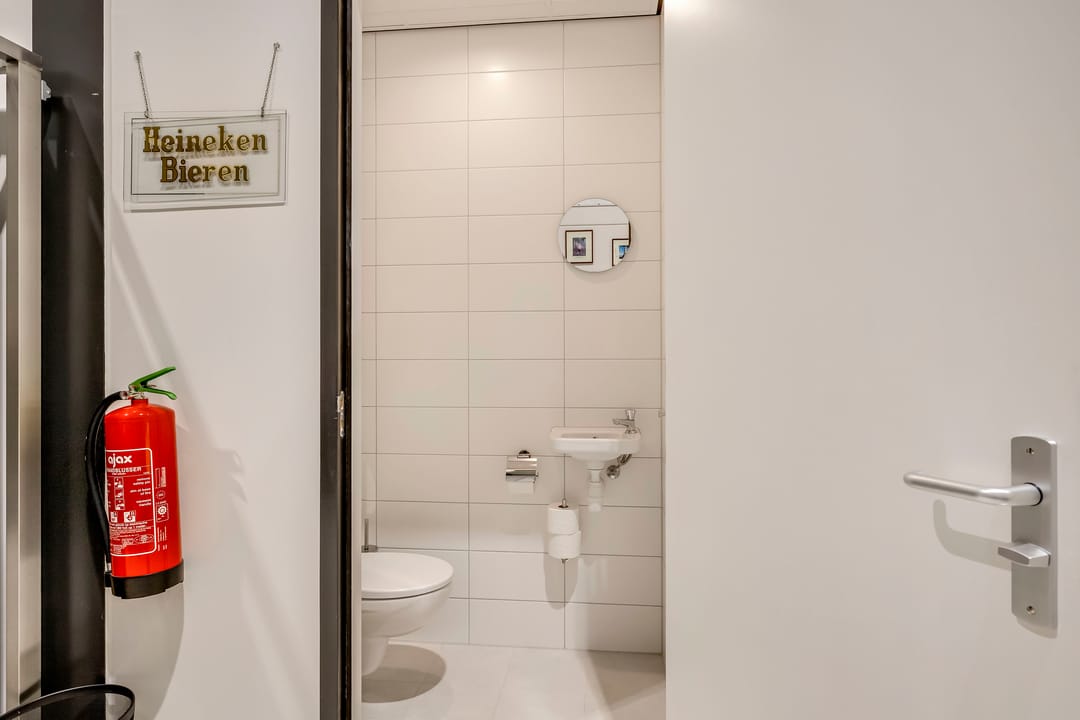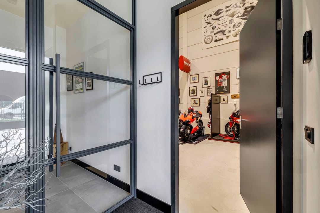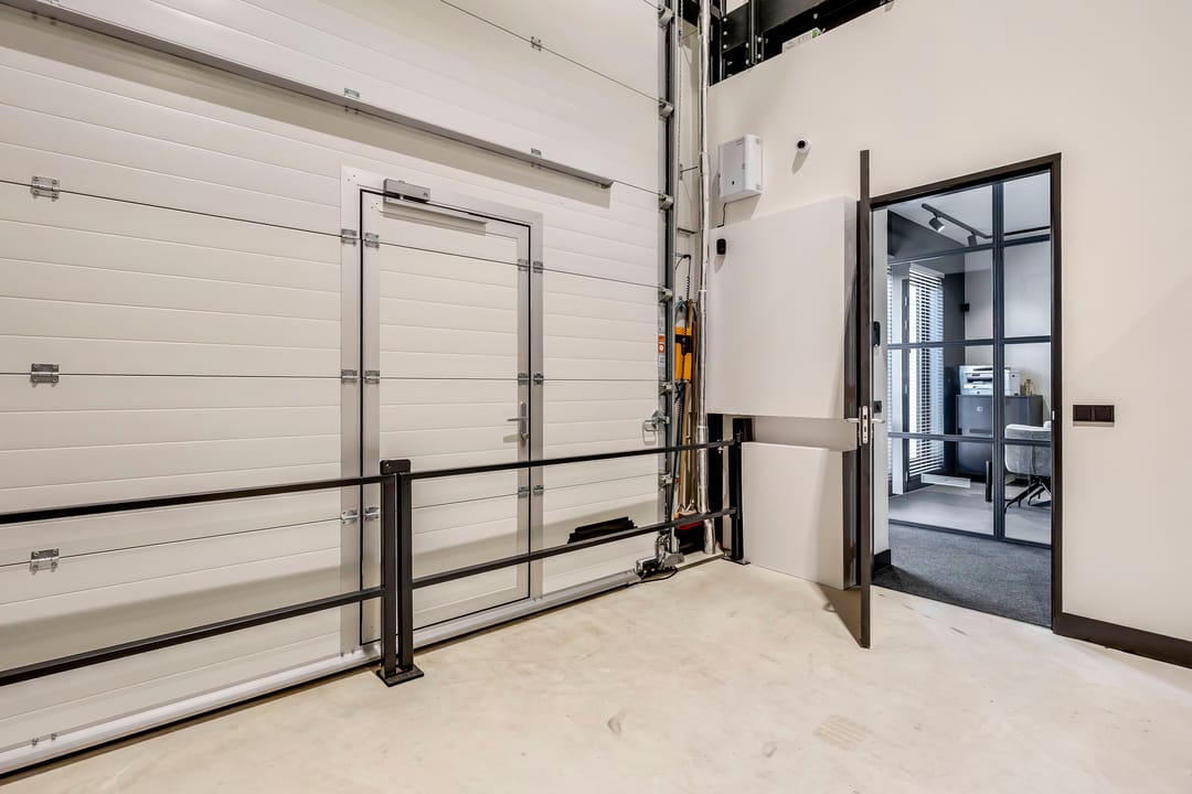 Stijlvolle entree met industriële zwartstalen pui, toegang tot de bedrijfshal en doorloop naar de showroom / spreekkamer aan de voorzijde van het pand. Deze ruimte is voorzien een keurig gelegde tegelvloer, pantry in rechte opstelling en lichte kleurstelling voorzien van inductie-kookplaat, vaatwasser, koelkast en vriezer. Aansluitend de luxe volledig betegelde douche met cabine, wastafelmeubel en handdoekradiator. De ruimte is voorzien van mechanische ventilatie.