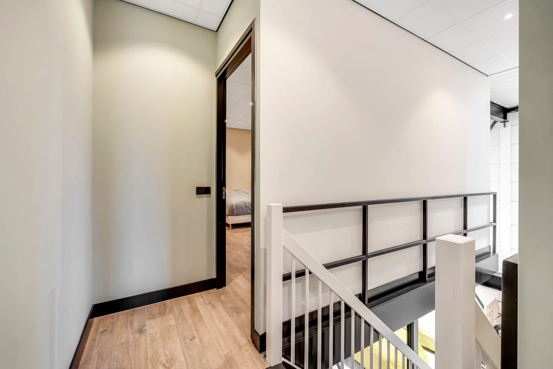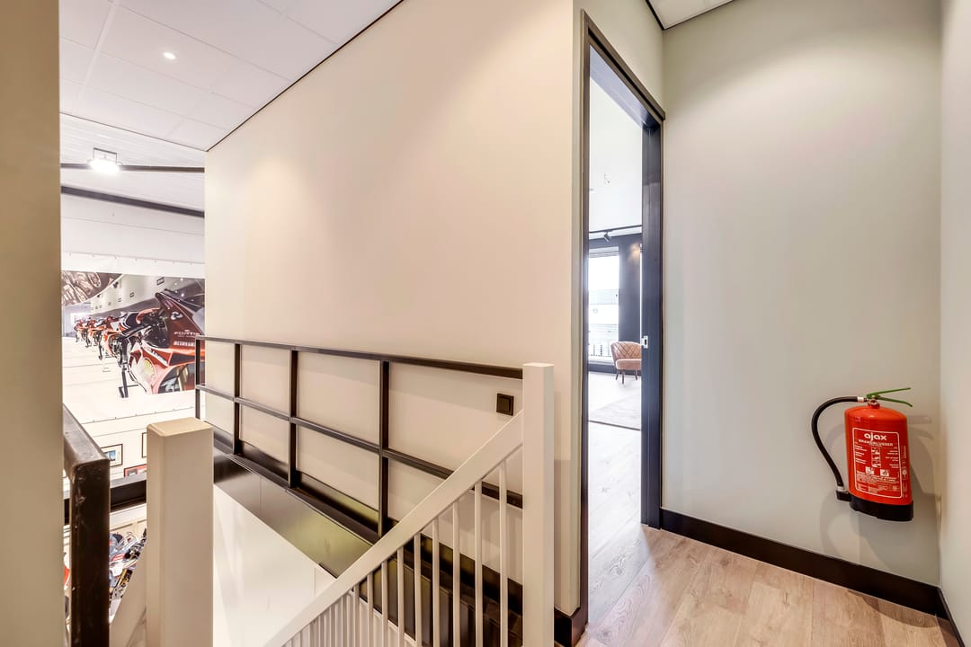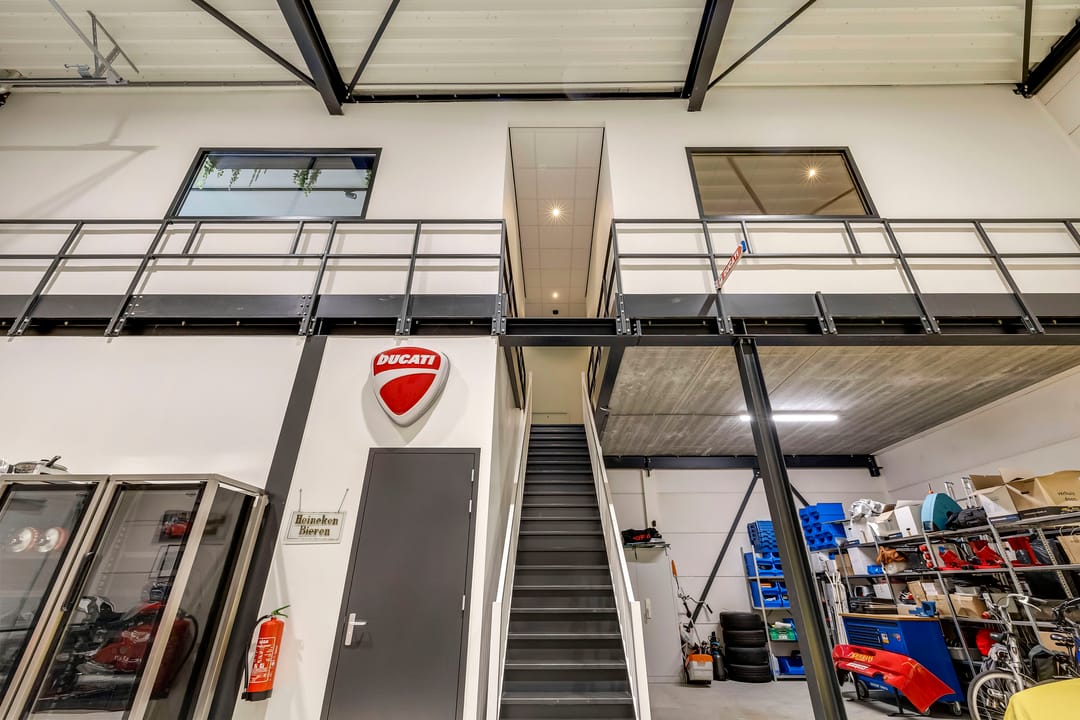 Trapopgang naar de eerste verdieping waar twee ruime kantoren zijn gerealiseerd. Kantoorruimte aan de voorzijde met veel daglicht toetreding, airco, pvc vloer en doorkijk naar de bedrijfshal, Tweede kantoor aan de achterzijde met systeemplafond voorzien van inbouwverlichting, tevens toegangsluik naar het dak.