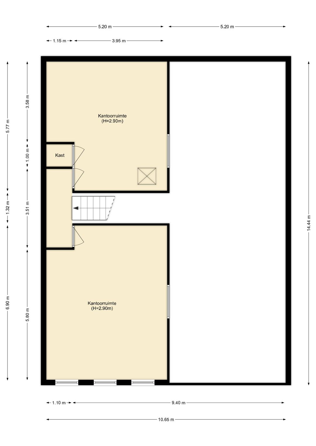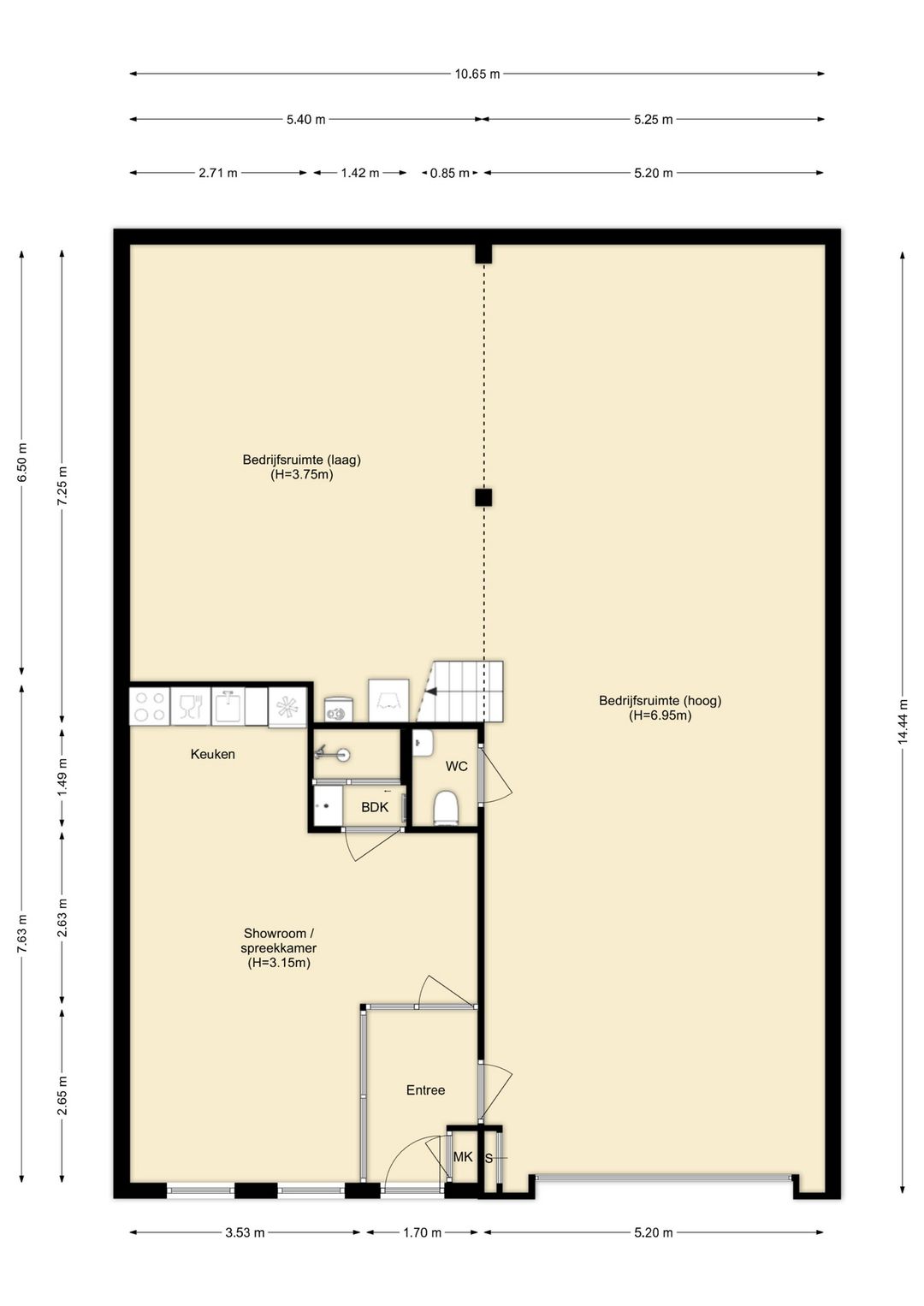 Bovengenoemde meters zijn gebaseerd op een NEN2580 meetcertificaat. Vrije hoogte is van de bedrijfshal beneden is 6,95m en boven 2,90m.