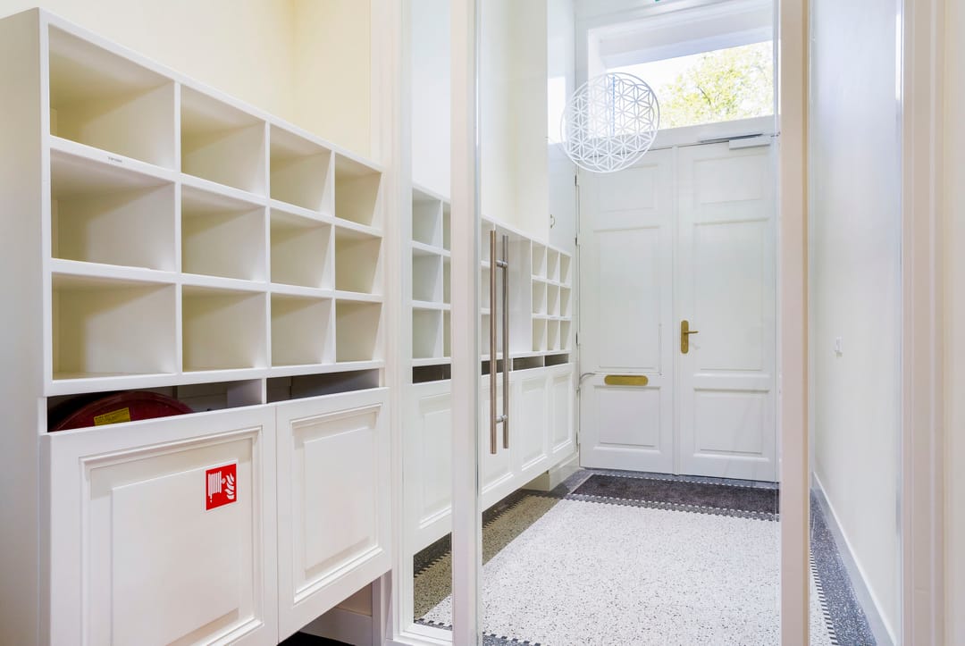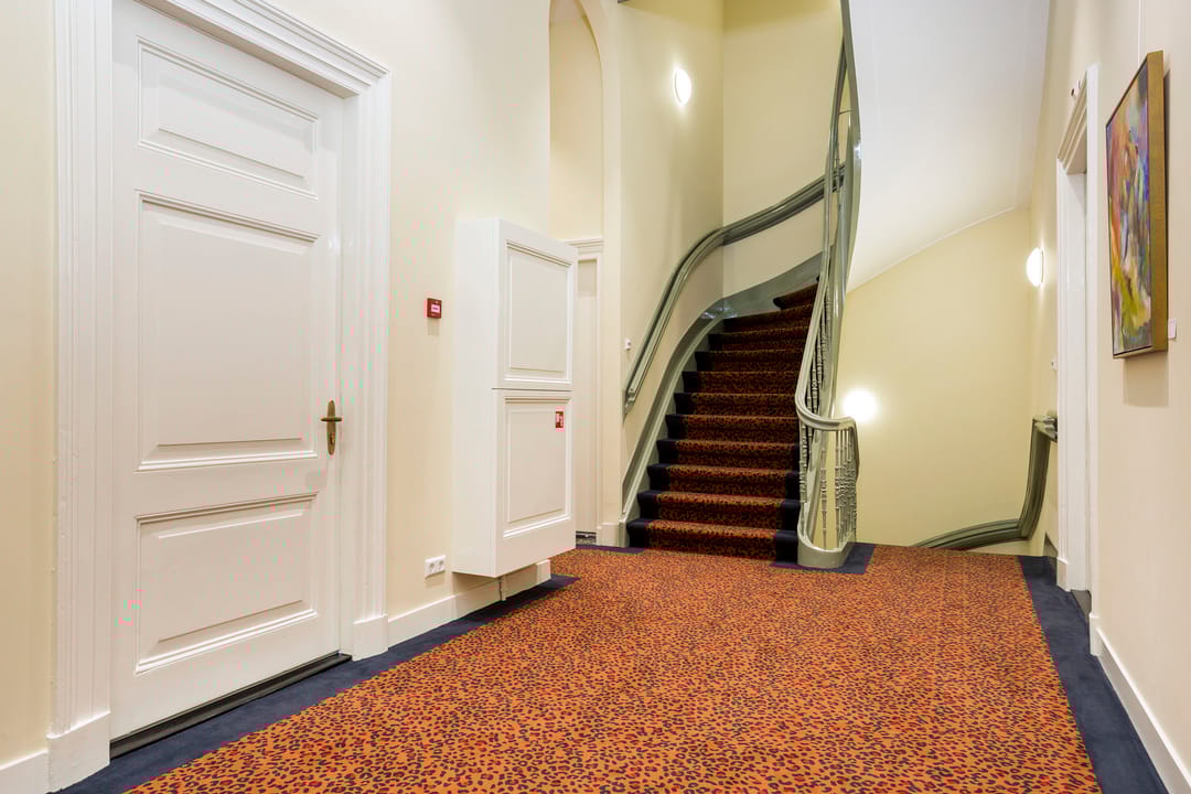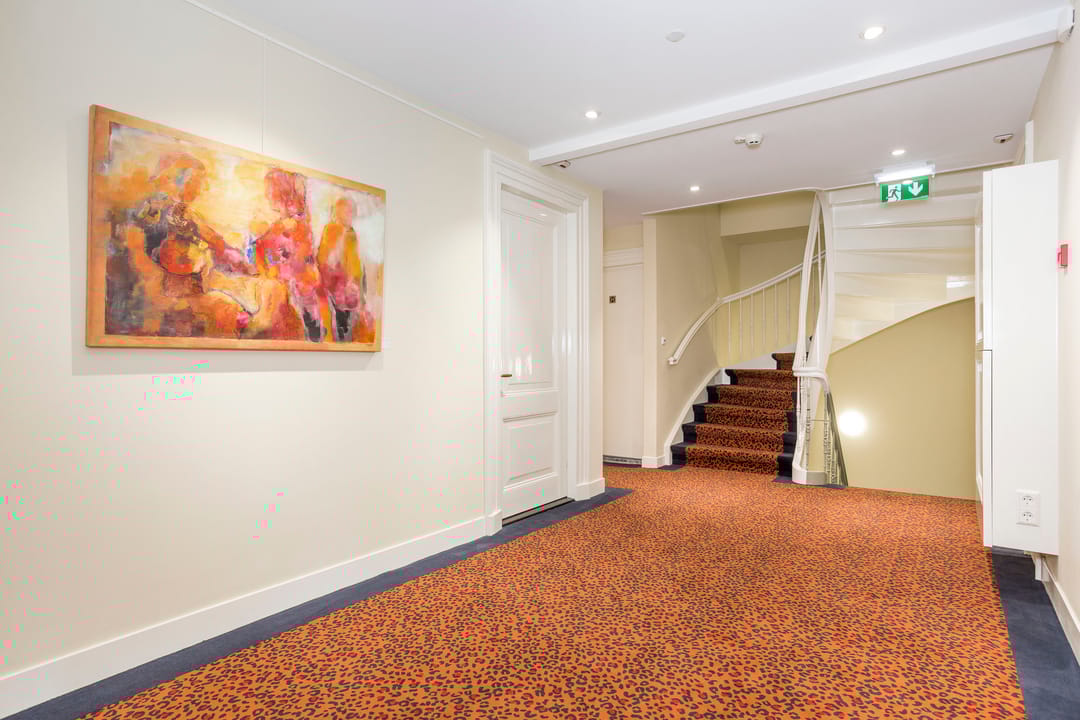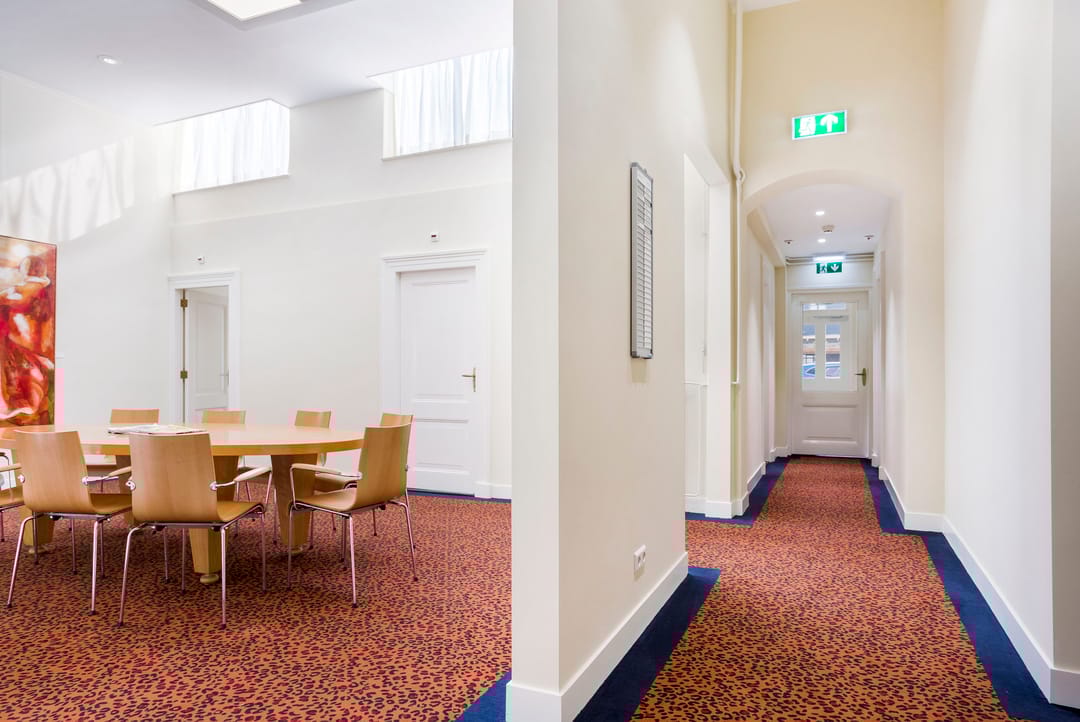 Monumentale entree, ruime hal met gemeenschappelijke wachtruimte en authentieke fraaie trappartij naar de verdiepingen, vloerbedekking, verwarming, stuc-/ en zweefplafonds met verlichting, pantry, toiletvoorzieningen op elke verdieping. Op de begane grond is een gemeenschappelijke spreekkamer en het souterrain een mooie complete keuken waarvan ook iedere huurder gebruik kan maken.