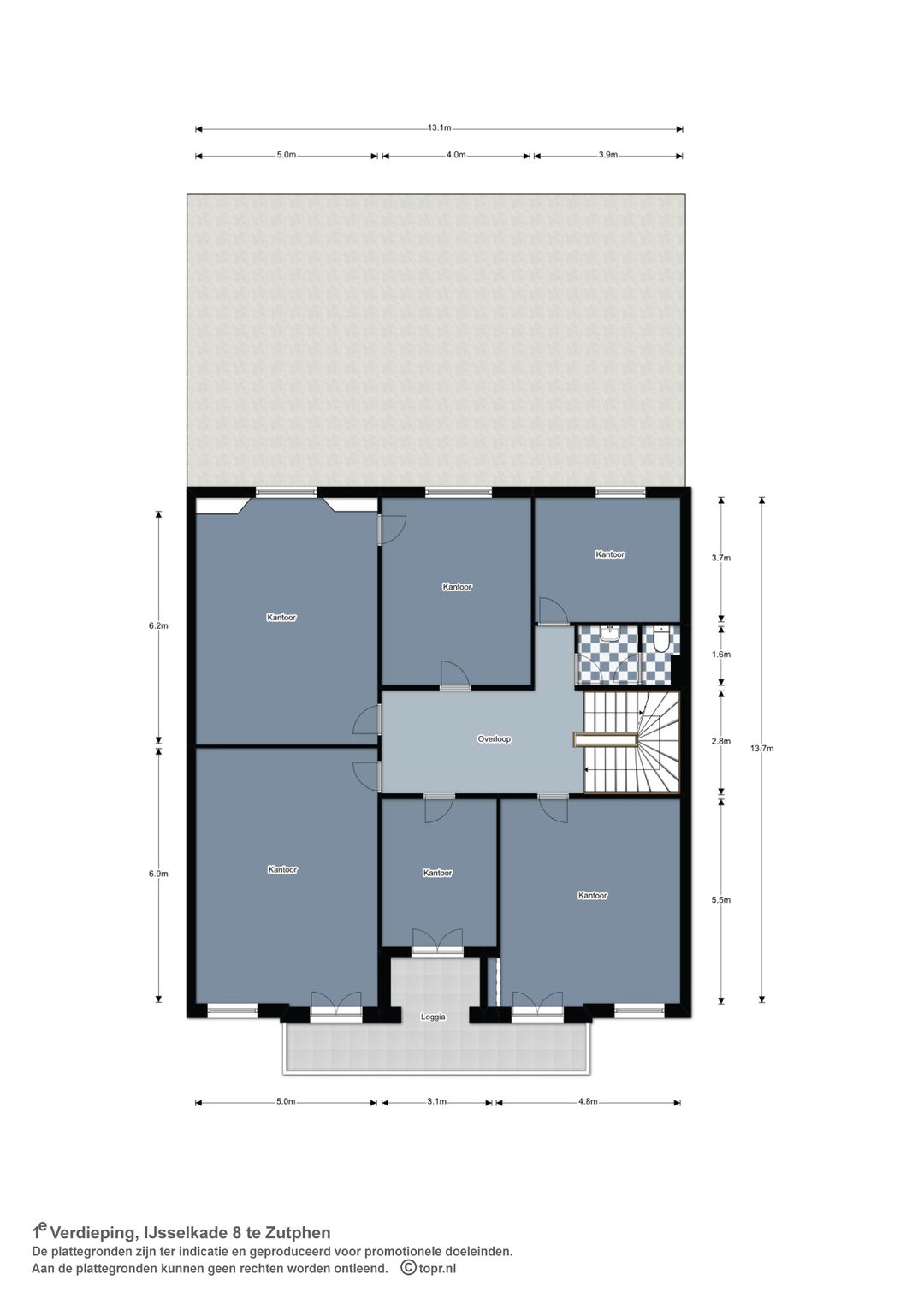 In totaal is er in deze monumentale villa ca. 793 m² kantoorruimte aanwezig, die kamergewijs wordt verhuurd. Er is nog één kamer voor verhuur beschikbaar.