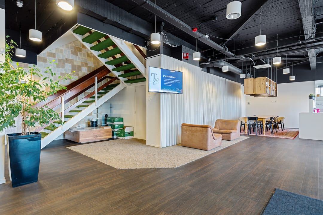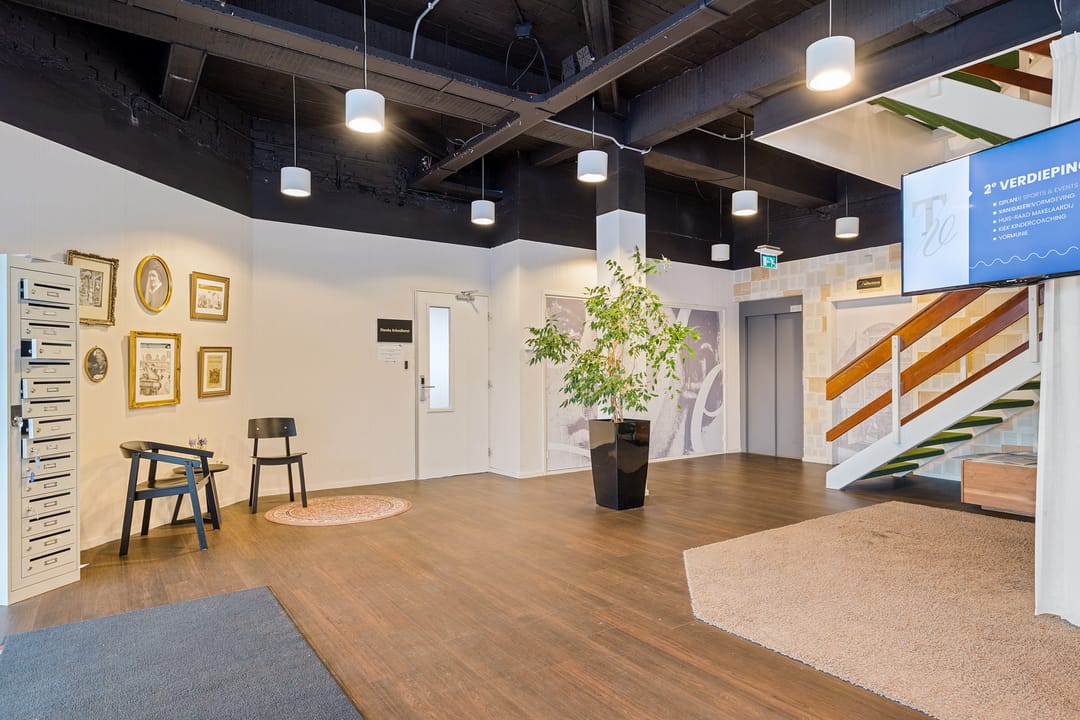 Bij aankomst parkeert u op eigen terrein en betreedt u het gebouw via een stijlvolle gezamenlijke ontvangstruimte. Deze ruimte is meer dan alleen een entree: u vindt hier een ruime pantry/bar met koffievoorziening en meerdere comfortabele zit- en werkplekken. Van informeel overleg op de bank tot een vergadering aan tafel met ruimte voor circa 10 personen – alles is aanwezig om prettig en professioneel te werken.