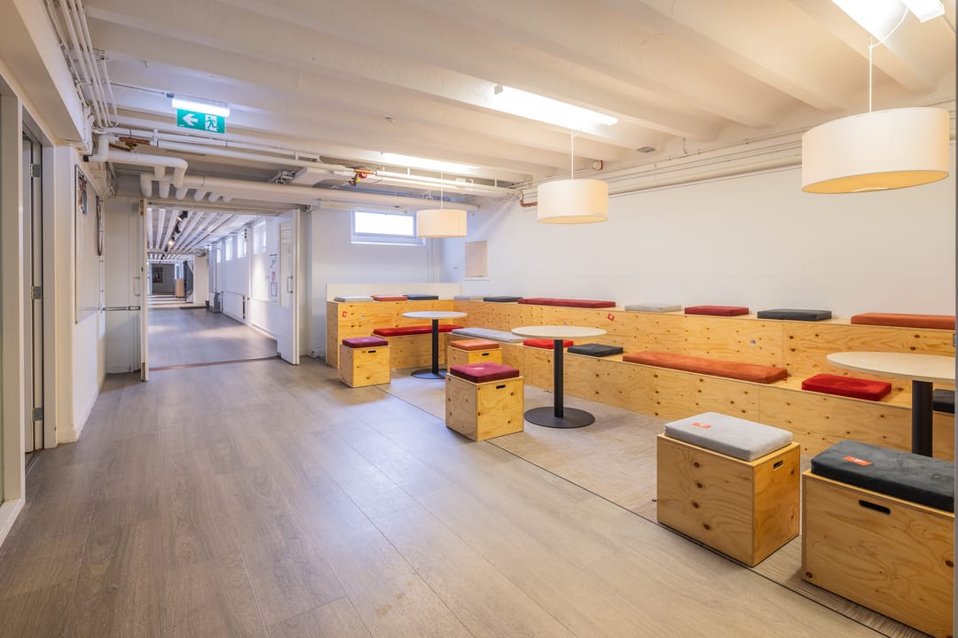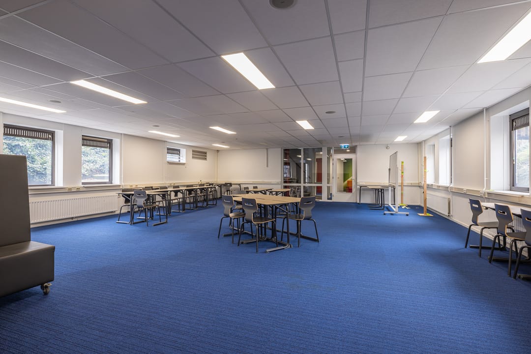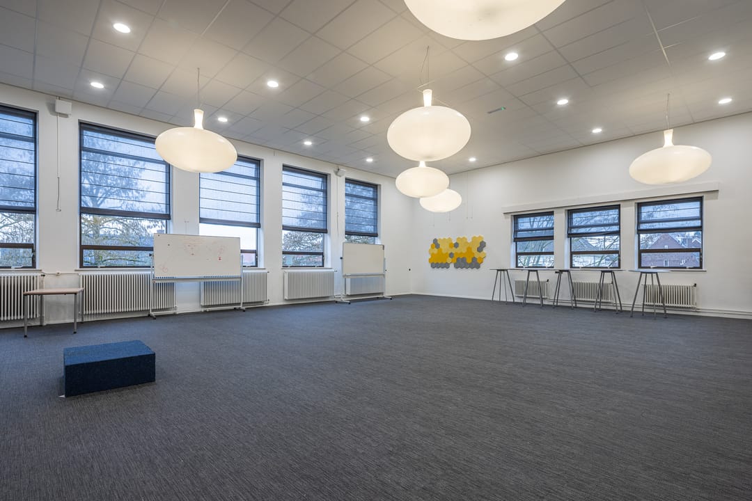 De begane grond biedt een ruime ontvangstruimte, waar de receptie en aansluitend een aantal kantoorruimtes zijn gesitueerd. Vanuit de ontvangstruimte is een lange gang met diverse lokalen/lesruimtes. De grote raampartijen in de gang zorgen voor veel lichtinval. Aan het einde van de gang bevinden zich een aantal lokalen in diverse metrages en de gymzaal. De gymzaal wordt momenteel niet meer gebruikt als gymzaal, maar als auditorium/presentatieruimte en deels als muziekruimte. De eerste verdieping is toegankelijk via twee trappenhuizen en een lift. Deze verdieping heeft deels dezelfde indeling als de begane grond, al wijken de metrages van de lokalen/lesruimtes af. Tevens bevinden zich hier twee grote auditorium/presentatieruimtes. In de jaren ’90 hebben er diverse uitbreidingen plaatsgevonden aan de achterzijde van het object, gelegen aan de Willem Schiffstraat. Deze uitbouw is toegankelijk via de verschillende bouwlagen en beschikt over een trap en een lift.