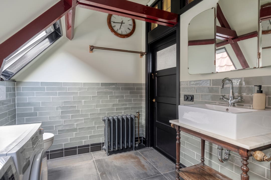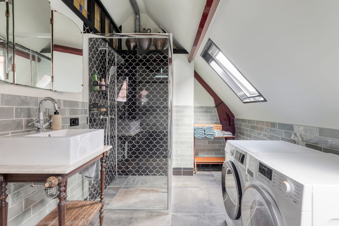 De badkamer is royaal en licht, voorzien van een inloopdouche, wastafel, toilet en aansluitingen voor wasmachine en droger. Meerdere dakramen zorgen voor overvloedig natuurlijk licht, waardoor de ruimte luchtig en uitnodigend aanvoelt. Deze verdieping combineert optimaal comfort, functionaliteit en flexibiliteit.