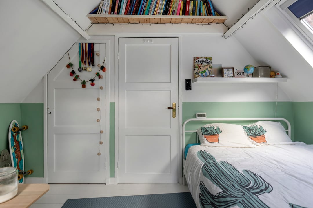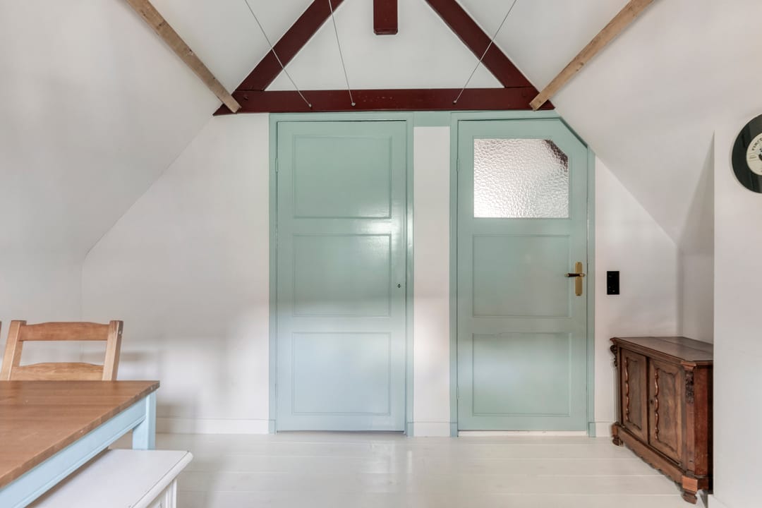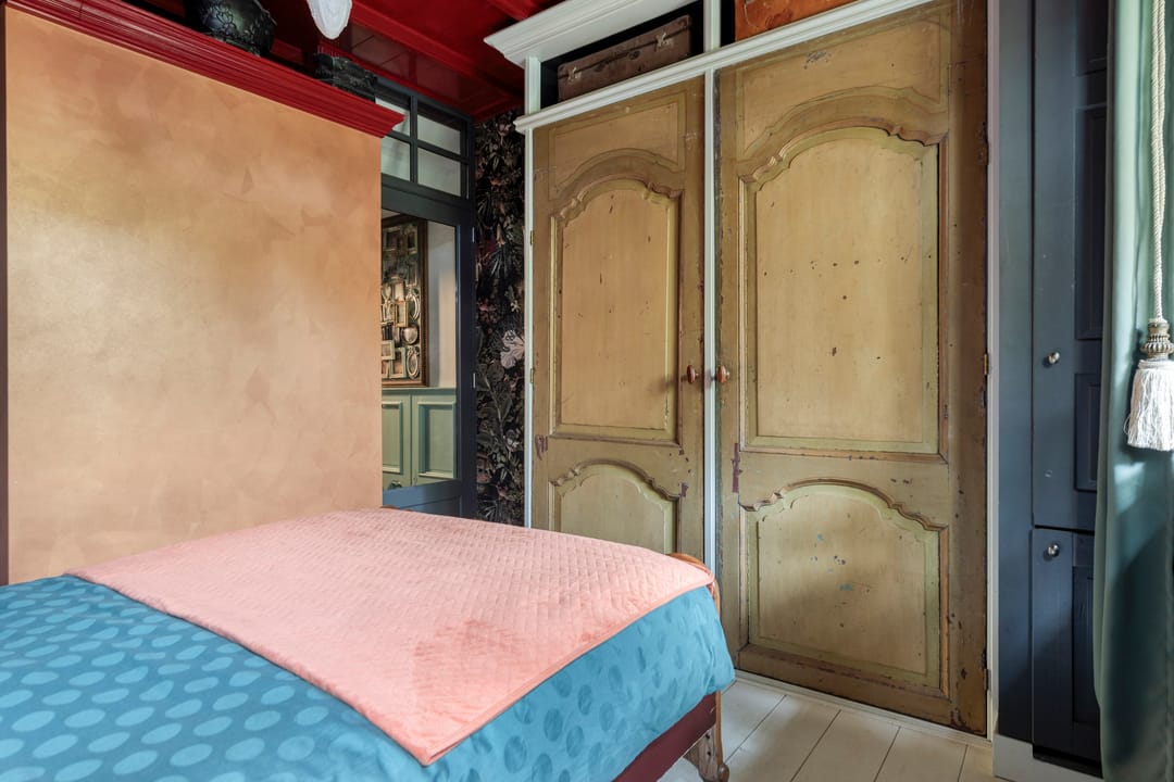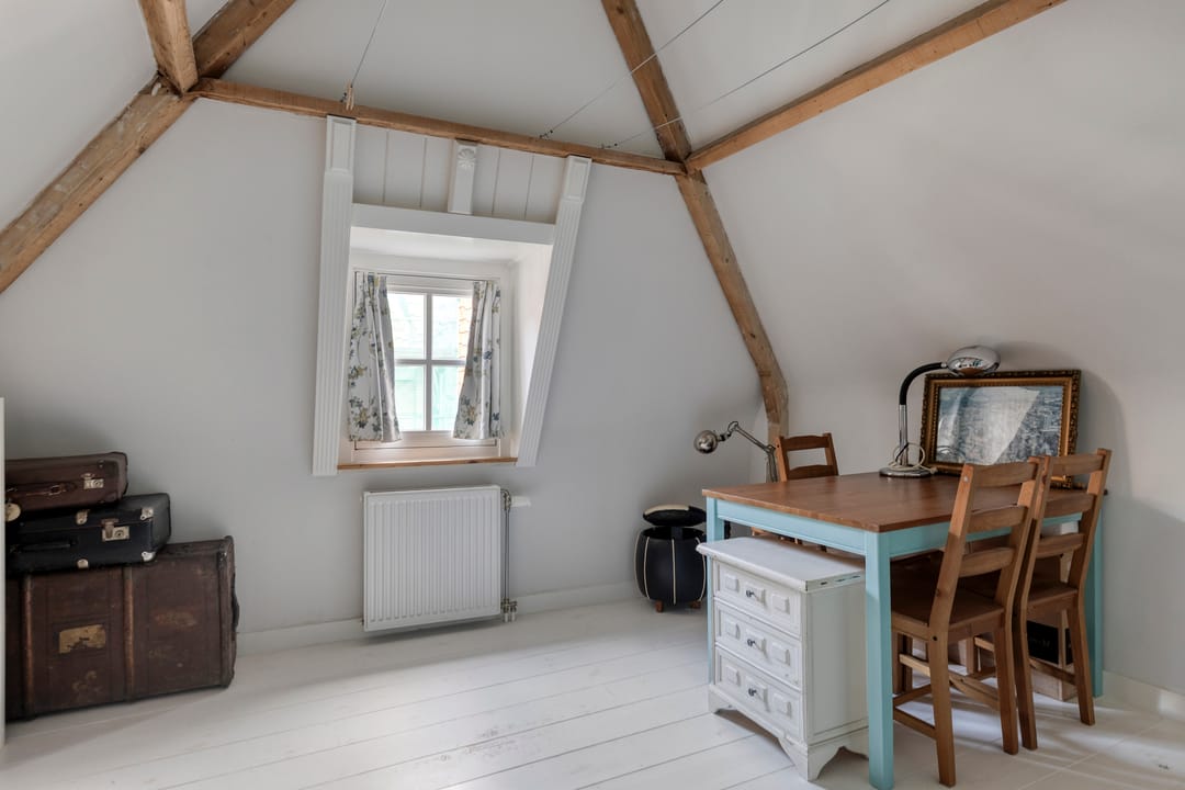 Aan de achterzijde bevindt zich een sfeervolle slaapkamer met ossenrode balken, ingebouwde antieke kasten en een nostalgische uitstraling die doet denken aan een Engelse opkamer.