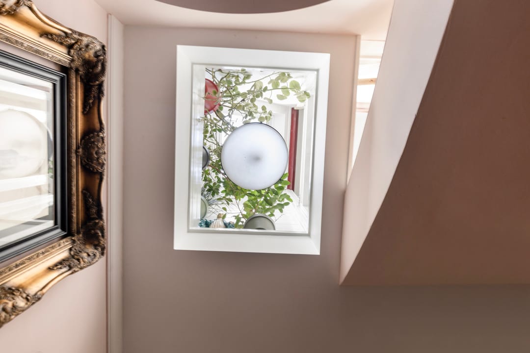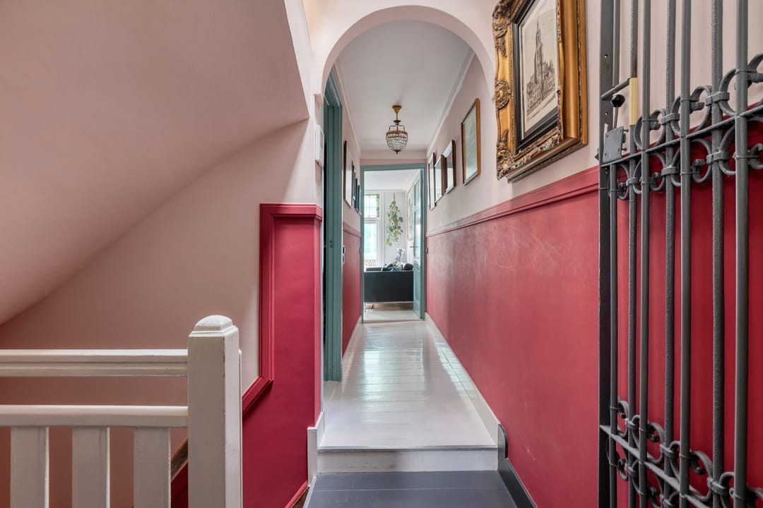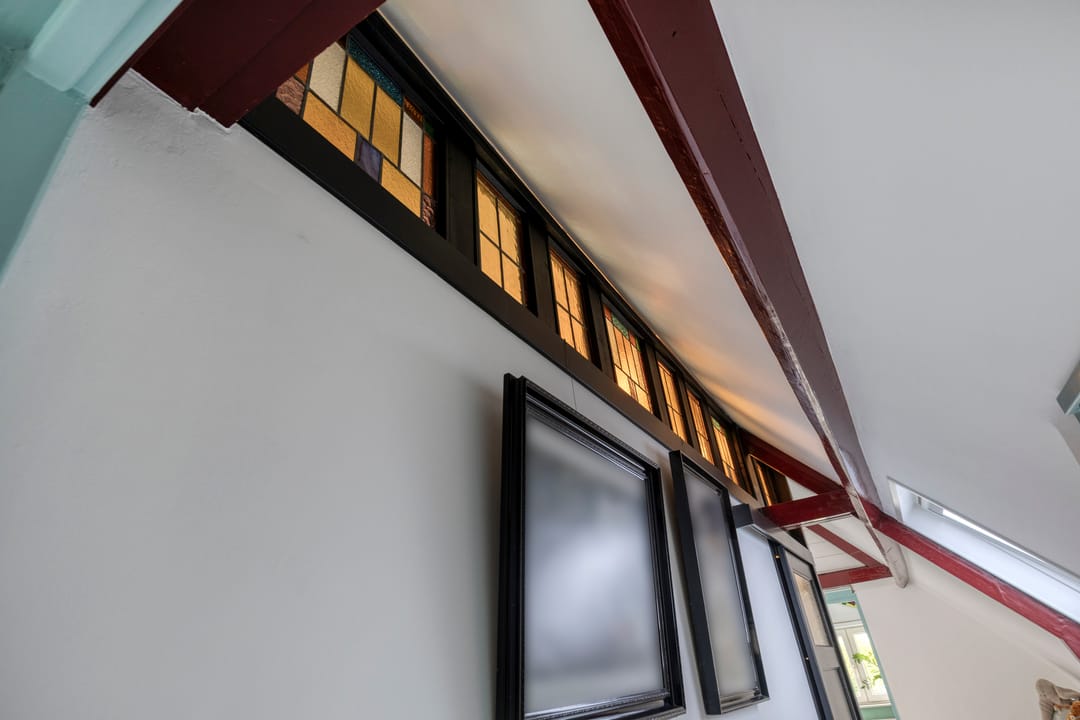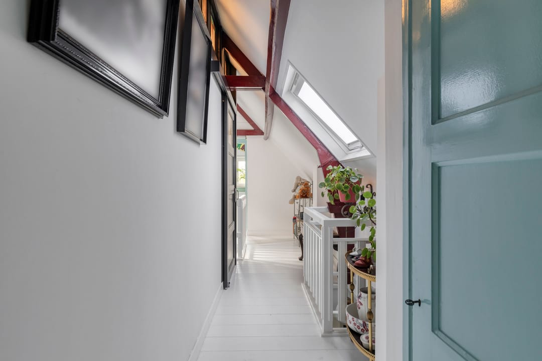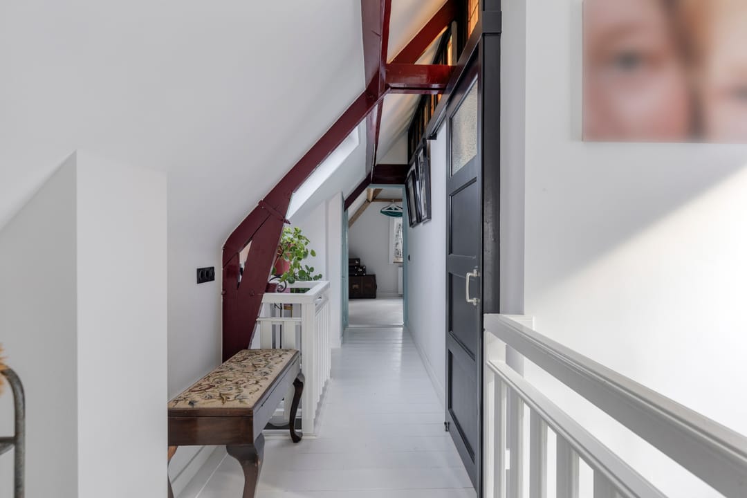 De tweede verdieping is een ware beleving van ruimte en licht. Tijdens de renovatie is het plafond opengebroken, waardoor de imposante kapconstructie en balkenstructuur volledig zichtbaar blijven. De overloop ademt charme en karakter, met enkele glas-in-loodramen als subtiel historisch accent en een speelse doorkijk naar beneden.
