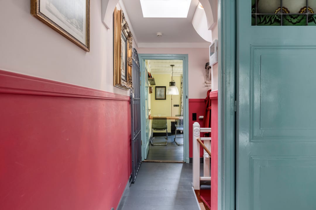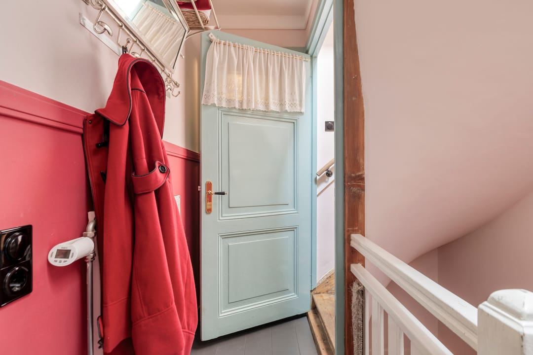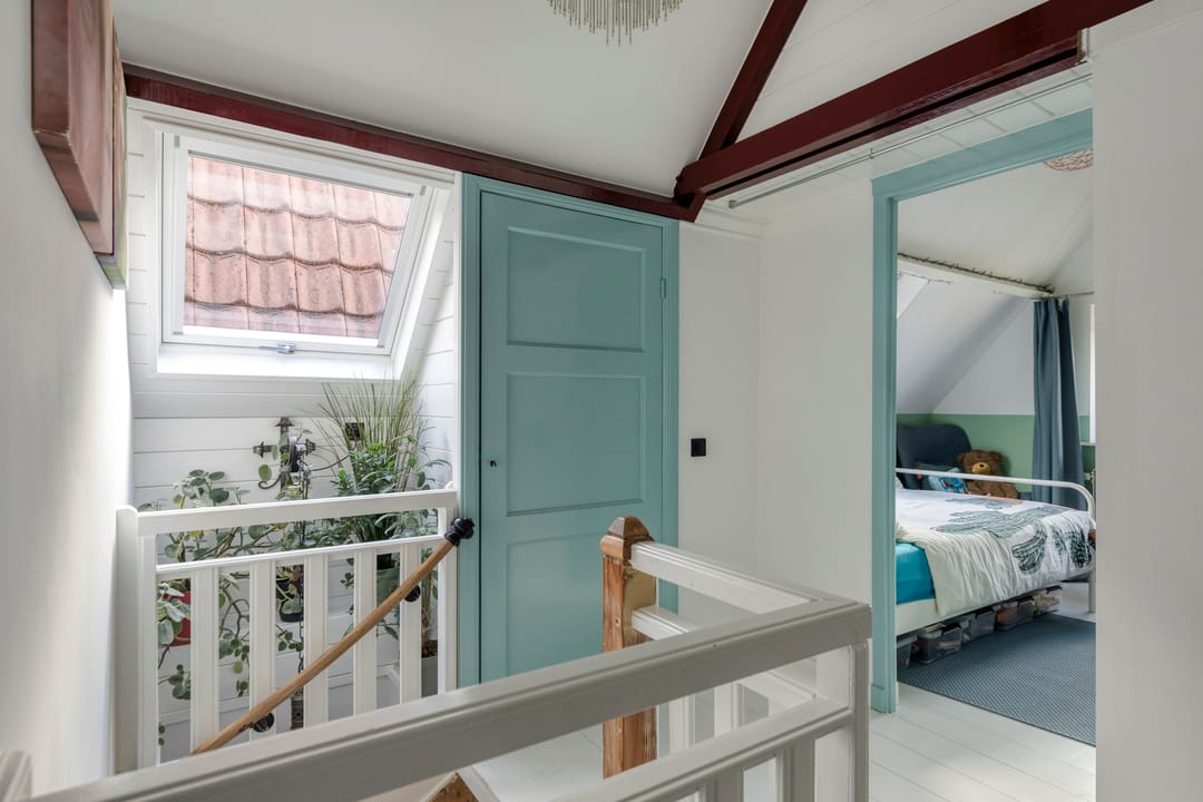 De gelakte massief grenen vloeren lopen door deze verdieping en versterken de warme en authentieke uitstraling..
