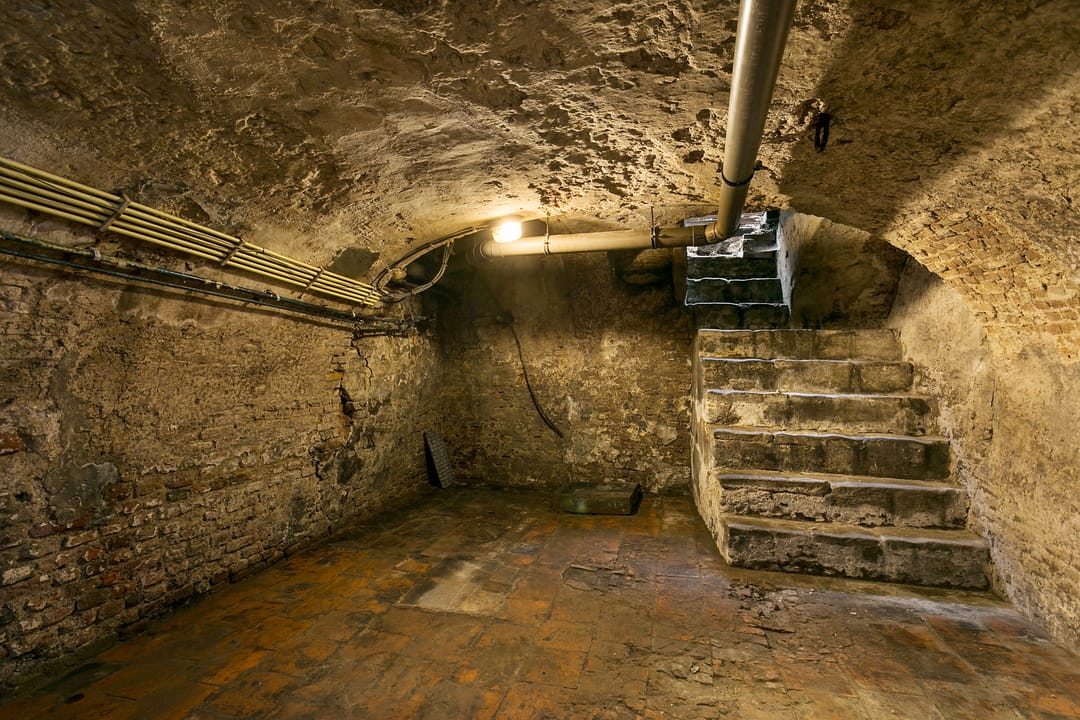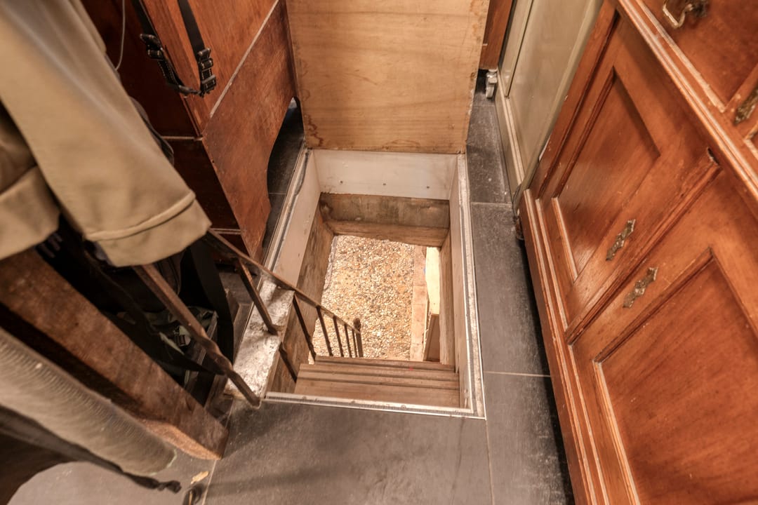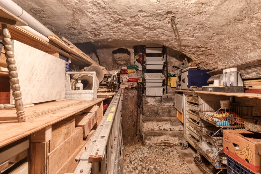 Vanuit de goudsmederij leidt een smeedijzeren trap met hardhouten treden naar de indrukwekkende, 16e-eeuwse kelder. Een stukje tastbare geschiedenis onder het huis.