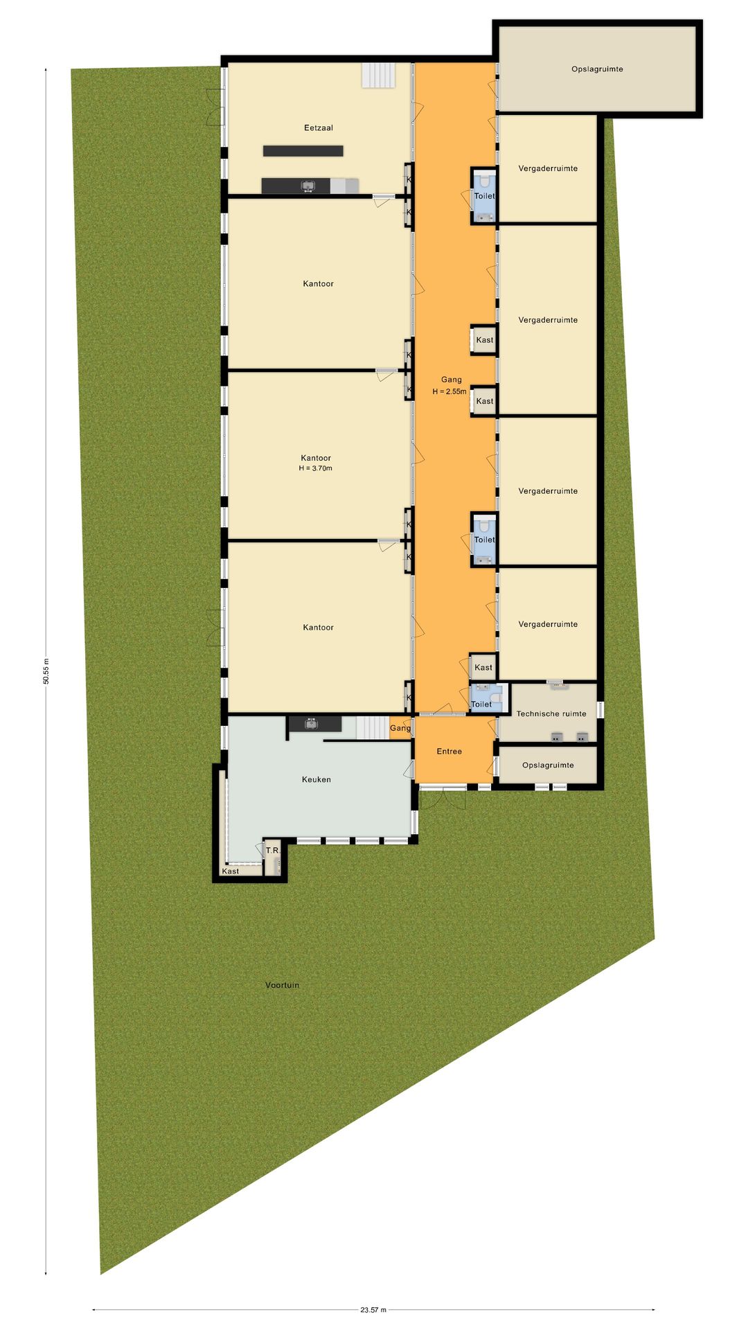 - begane grond: ca. 479 m² VVO en 540 m² BVO;