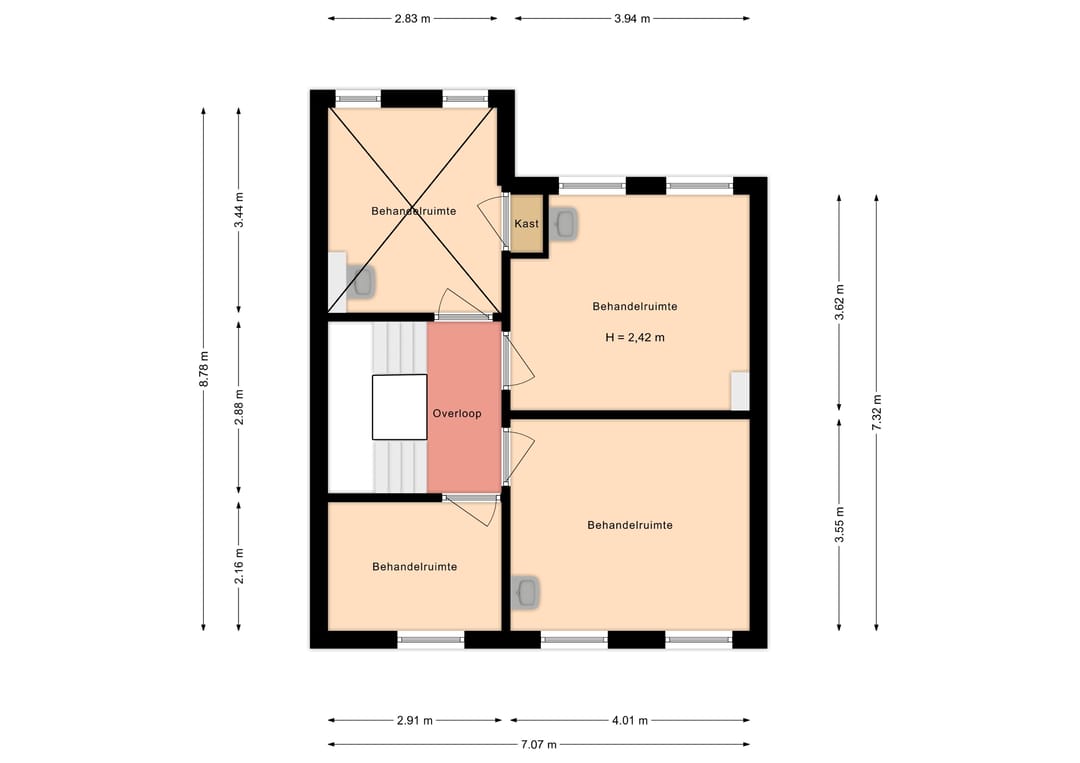 middels de trap naar de eerste verdieping zijn de volgende praktijkkamers bereikbaar:
