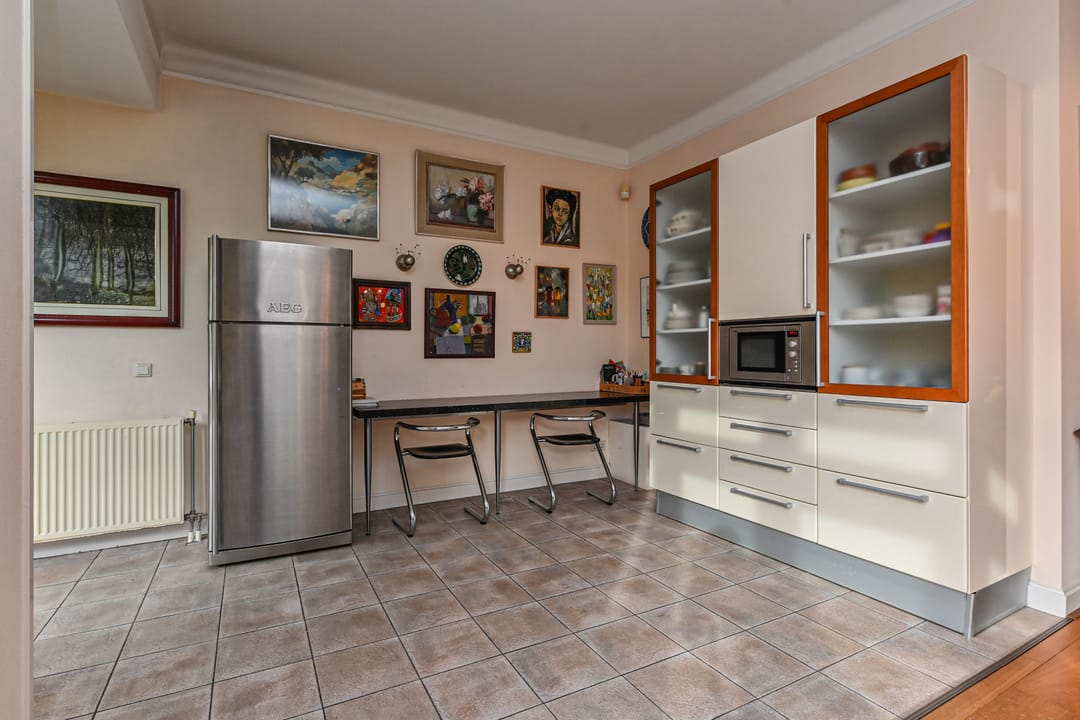 L - vormige woonkamer van ca. 46 m2 met aansluitend woonkeuken van ca. 18 m2. De keuken is in een L opstelling geplaatst. Vanuit de keuken doorloop naar bijkeuken van ca.6 m2 en vervolgens Deur naar grote garage van ca. 17 m2.