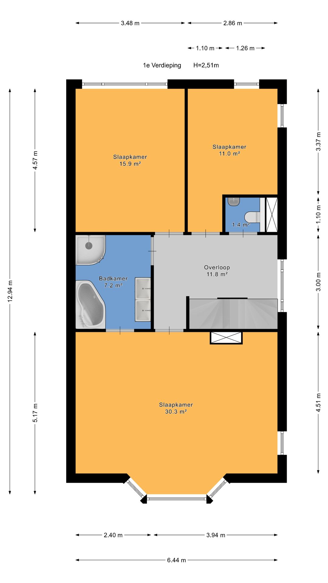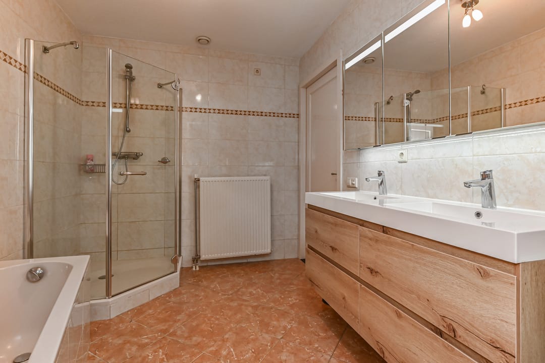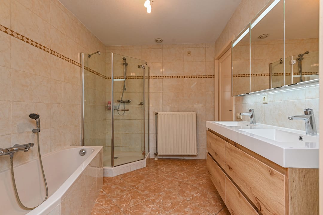 Overloop met toilet, twee slaapkamer aan de achterzijde van ca.16 m2 en 11 m2. Slaapkamer aan de voorzijde van ca. 30 m2. Moderne badkamer met ligbad, separate douche en dubbele wastafels.