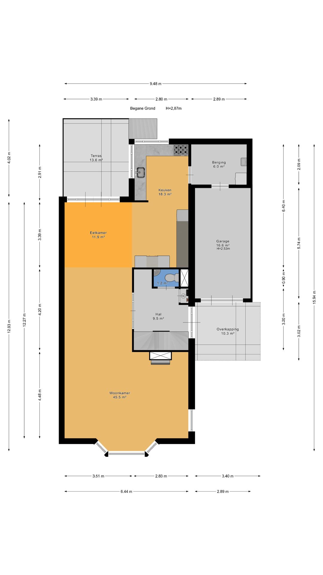 Zijentree, ruime hal met modern, vrijhangend toilet en meterkast.