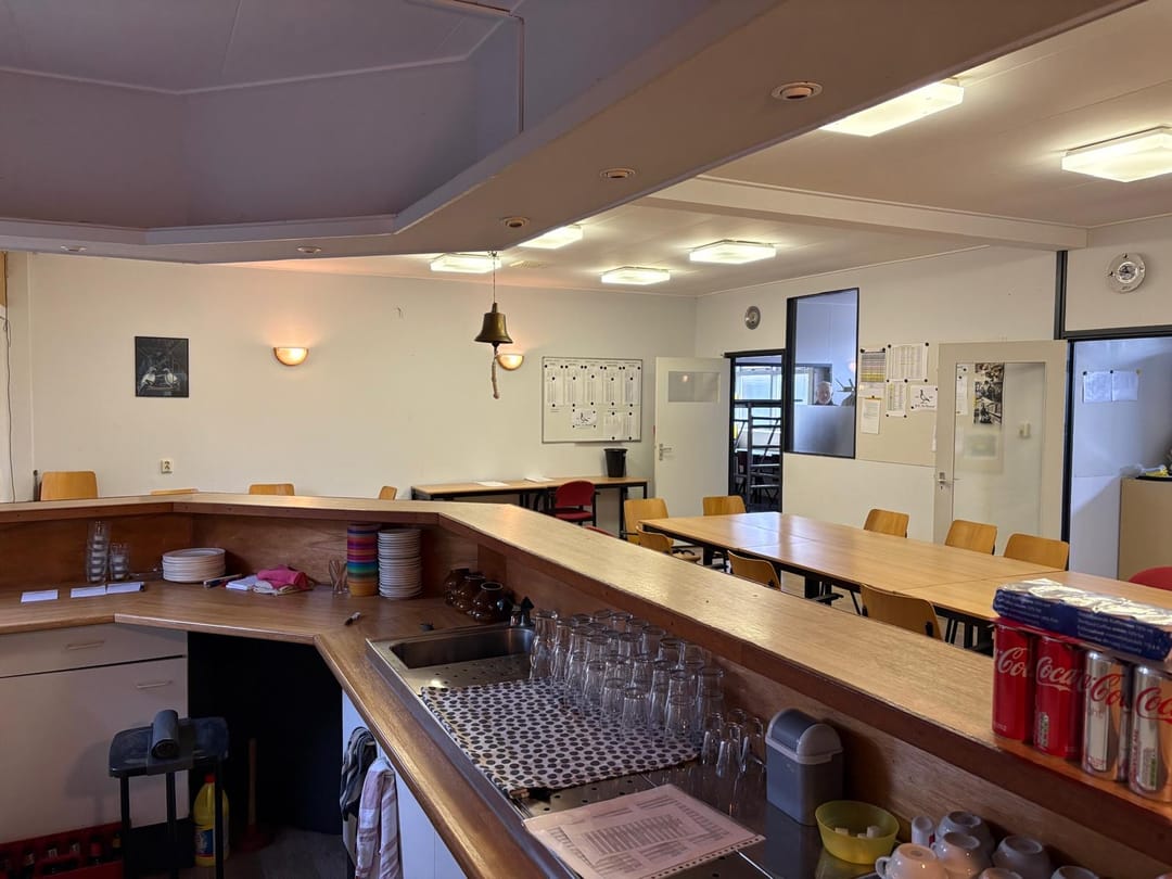 o.a. entree via dubbele deur, hal met toilet, meterkast en CV ruimte. Kantine-of vergaderruimte inclusief bar en pantry/keukenblokje.