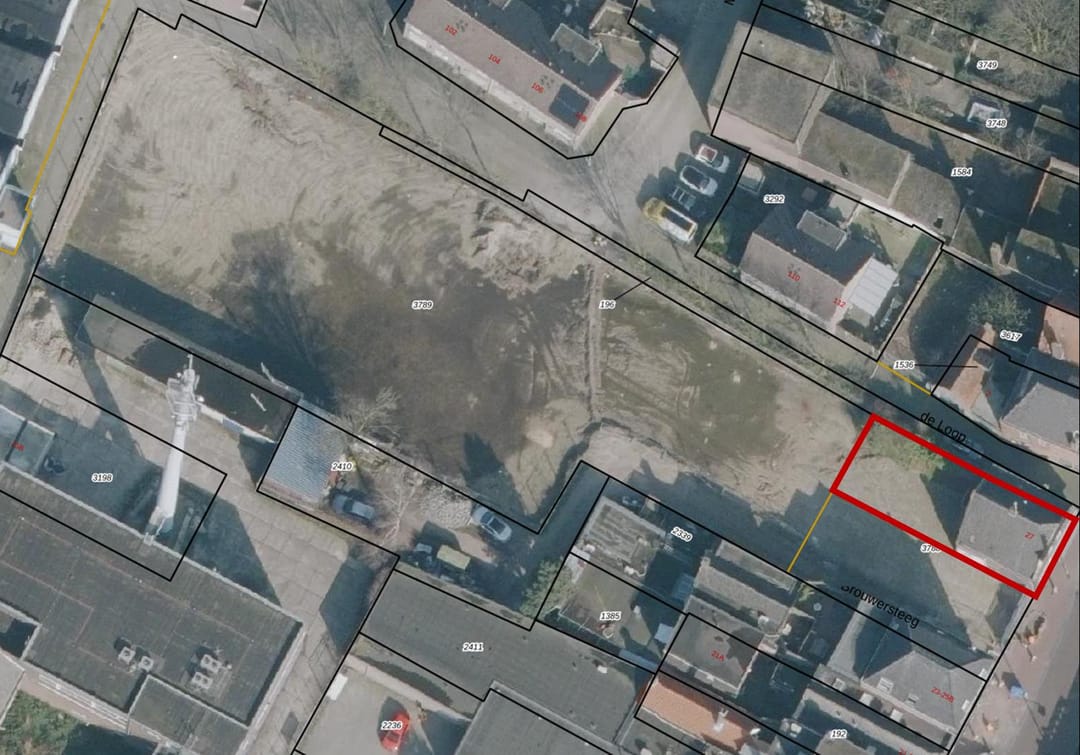 Oppervlakte: ca. 200m². Verkoper draagt zorg voor splitsing van het perceel vóór datum transport, conform de indicatieve tekening met rode arcering bij de foto's.