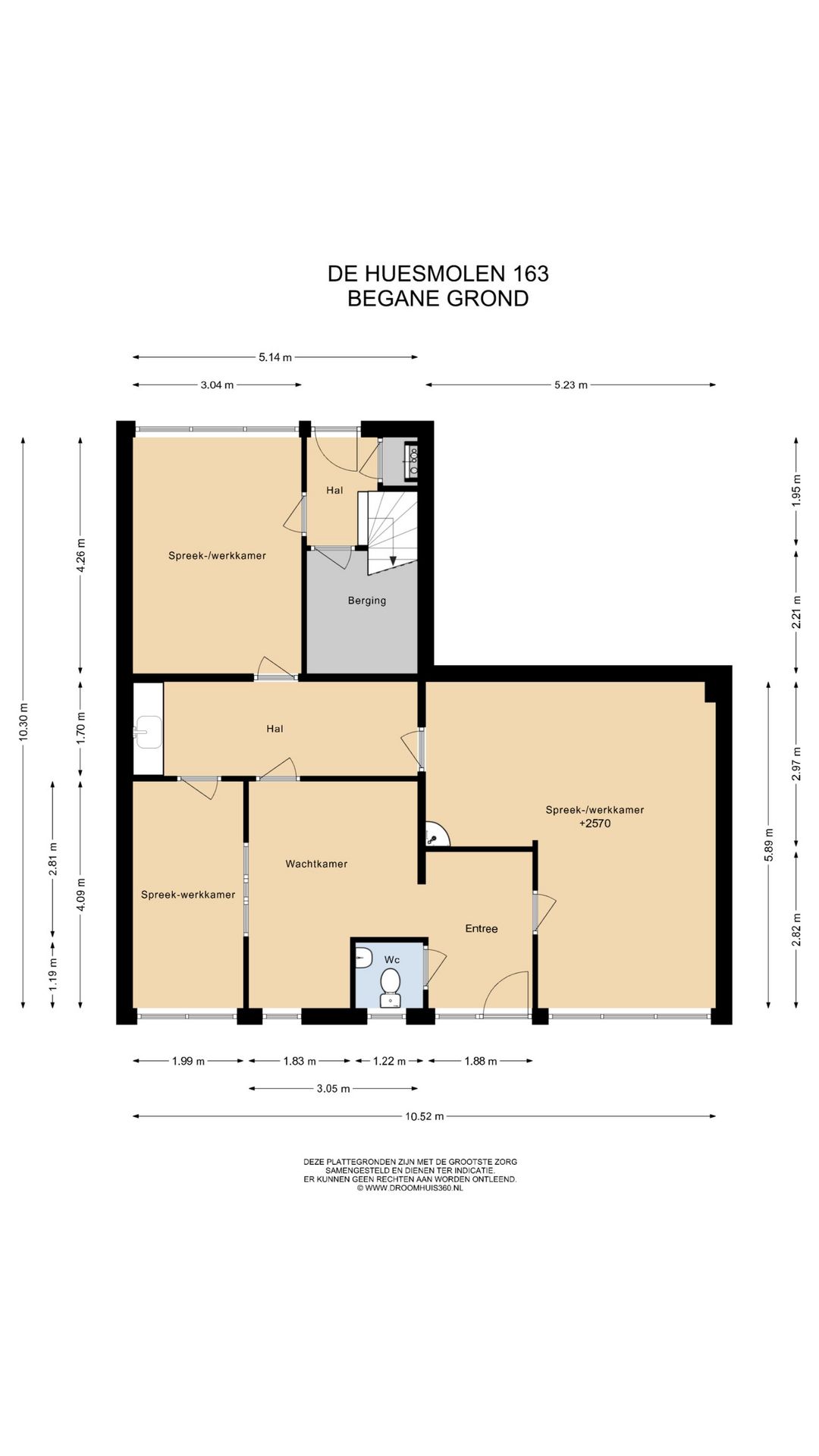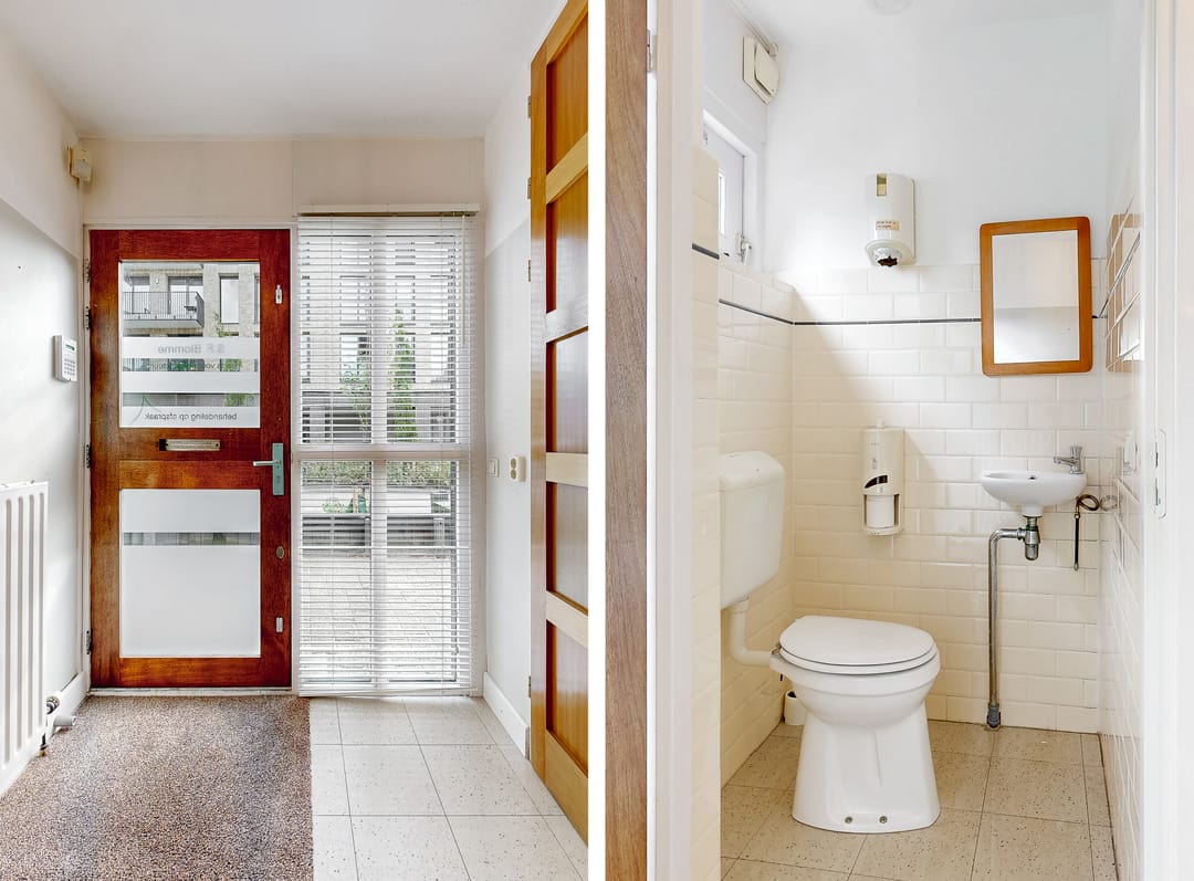 De begane grond omvat een entree met toilet, wachtkamer, 3 spreek-/werkkamers, hal met pantry, berging en achterentree ten behoeve van de dienstwoning.
