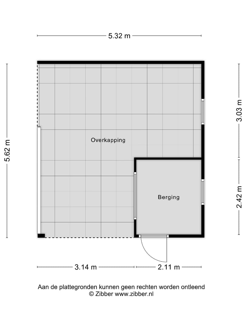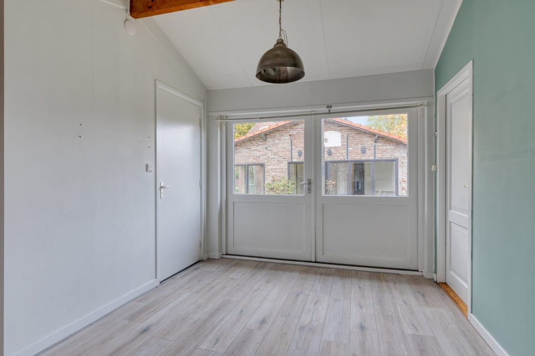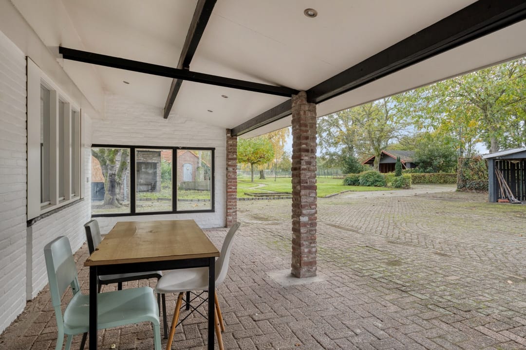 Aan de hoofdbouw zit een overkapping met zich op de tuin.