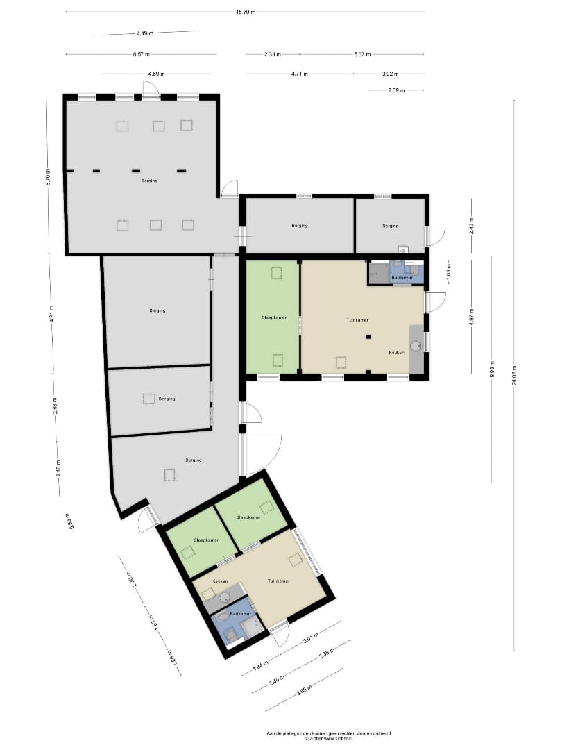 Verder zijn er drie bijgebouwen, huisjes, allemaal voorzien van eigen sanitaire voorzieningen, c.v. ketel, slaapkamer (s) en woonkamer. De huisjes verdienen allemaal aandacht, de staat van onderhoud is matig. Let wel, deze gebouwen hebben geen woonbestemming maar zijn wel recreatief te gebruiken dan wel ten behoeve van een gebruik in het kader van de maatschappelijke bestemming.
