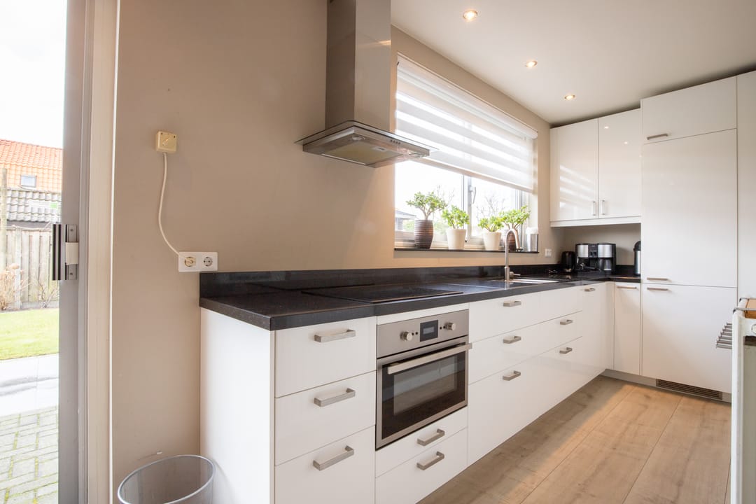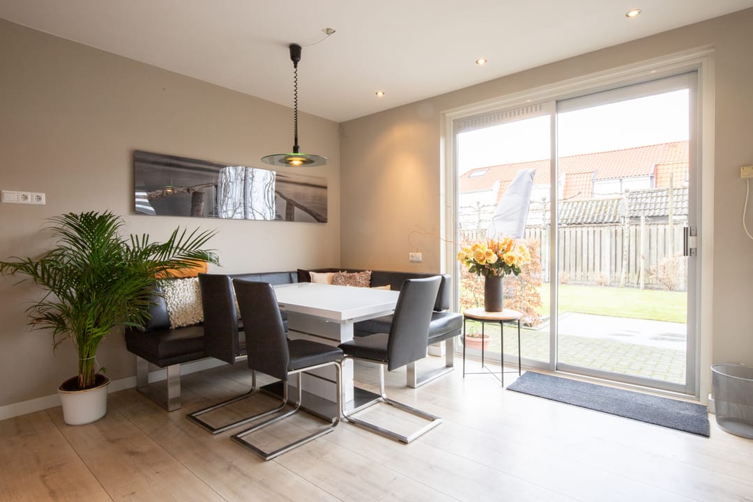 Middels de voordeur aan de zijkant bereikt u de hal/entree van de woning. Deze biedt toegang tot de woonkamer en keuken op de begane grond en een trapopgang naar de 1e verdieping. De woonruimte is voorzien van een eethoek met rechte keuken en heerlijk veel daglicht door de schuifpui en raampartijen aan de achterzijde. De keuken beschikt over diverse inbouwapparatuur en biedt mogelijkheden genoeg tot opbergen.
