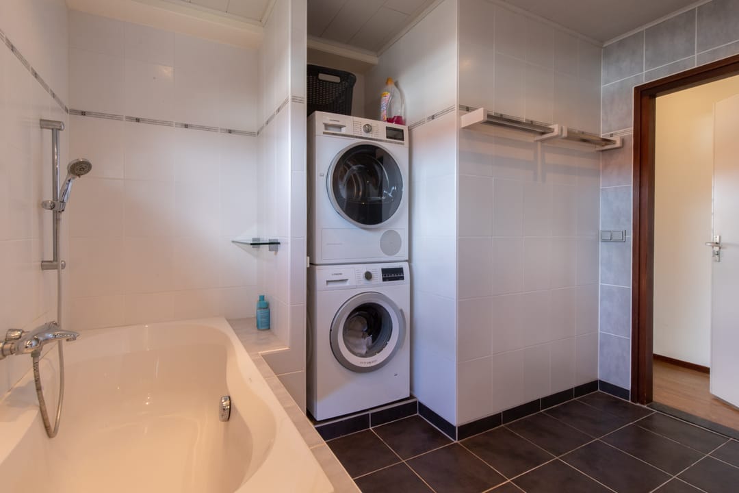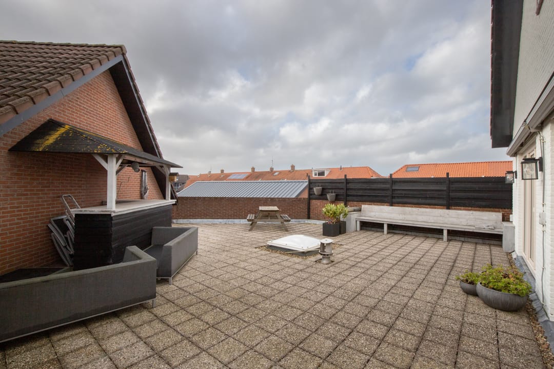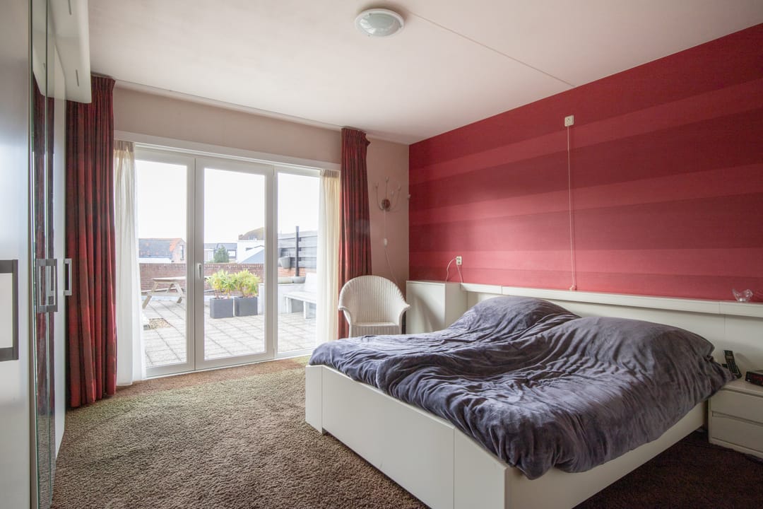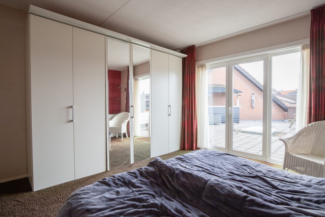 Aan de achterzijde treft u een tweetal slaapkamers, badkamer en apart toilet. De ouderslaapkamer is helemaal links gelegen en biedt net als de woonkamer openslaande deuren naar het dakterras. De badkamer beschikt over een ligbad, douche, aansluiting voor het witgoed en een dubbele wastafel.