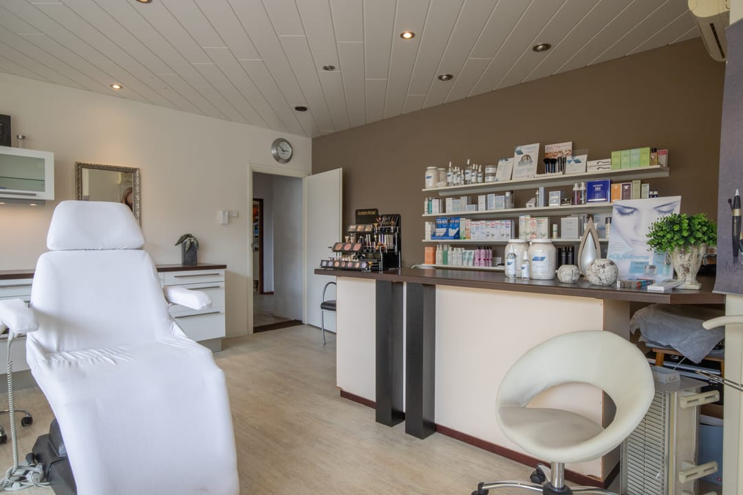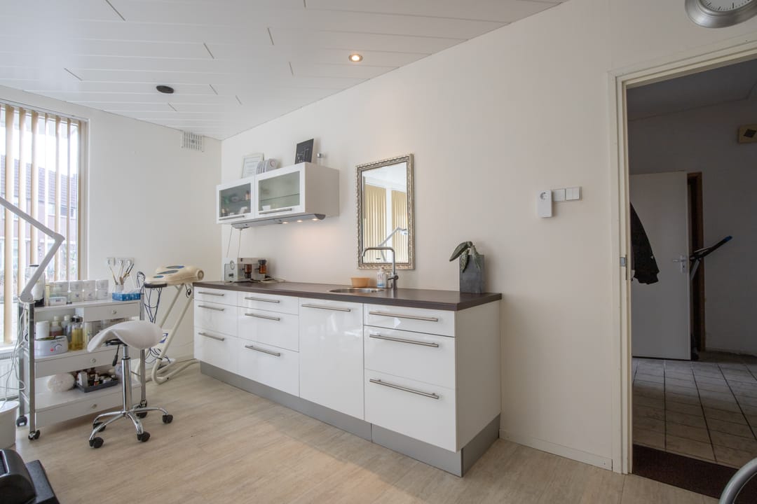 Via de voordeur bereikt u de entree van de praktijkruimte. De ruimte is geschikt als wachtkamer en biedt toegang tot een kamer achterin, nu nog zonnebank-kamer en tot de praktijkruimte. In de praktijkruimte is stromend water aanwezig. Via deze ruimte komt u terecht in het halletje wat toegang biedt tot de bezoekerstoiletten, het kantoor, de garage en de woonruimte op de begane grond.