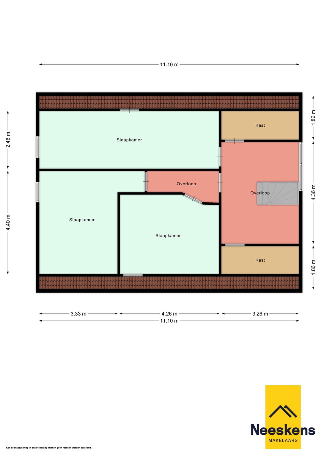 Neeskens Makelaars meet de woningen in volgens de laatste Nen-normen (NEN2580). Verschillen in de meetuitkomsten zijn niet volledig uit te sluiten door afrondingen, interpretatieverschillen of beperkingen tijdens het uitvoeren van de inmeting.