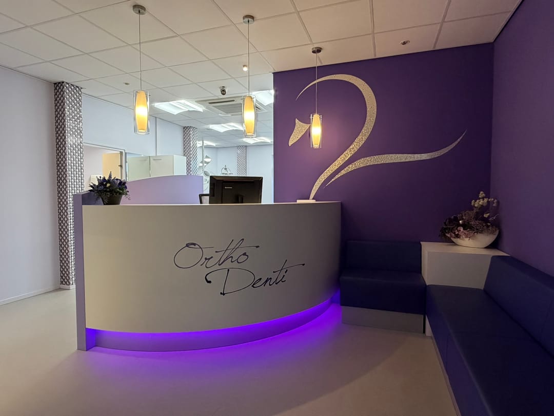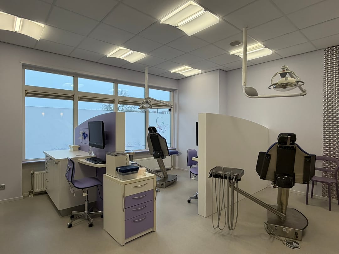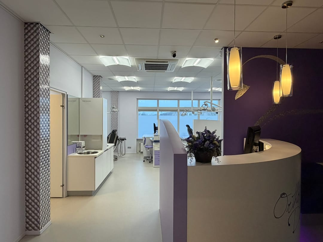 Indeling: entree met wachtruimte en ontvangstbalie, de praktijkruimte met 3 werkplekken, gescheiden via lage scheidingswandjes, een zgn. steri-ruimte of werkkamertje, toilet en de kantine-/spreekkamer met mooi keukenblok.